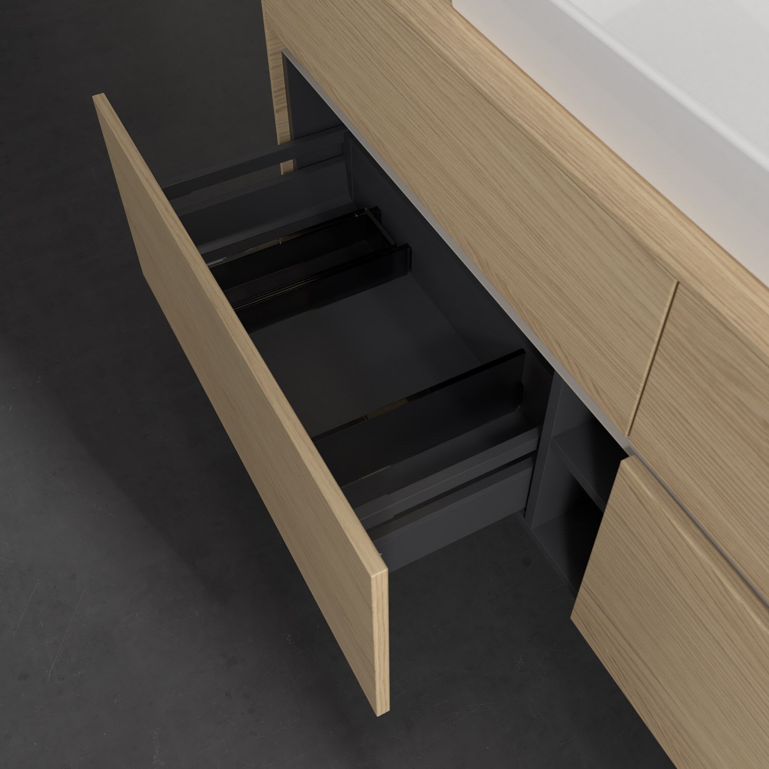 - kein Umfallen oder Verrutschen von Pflegeprodukten in den Schubladen dank rutschhemmendem Boden