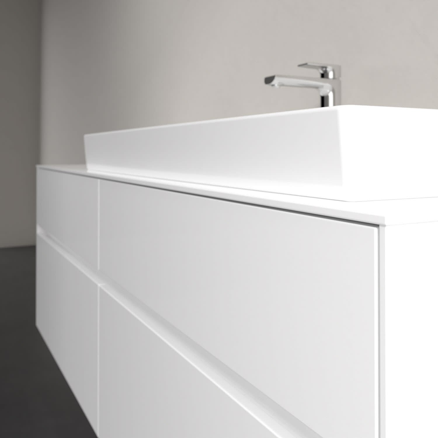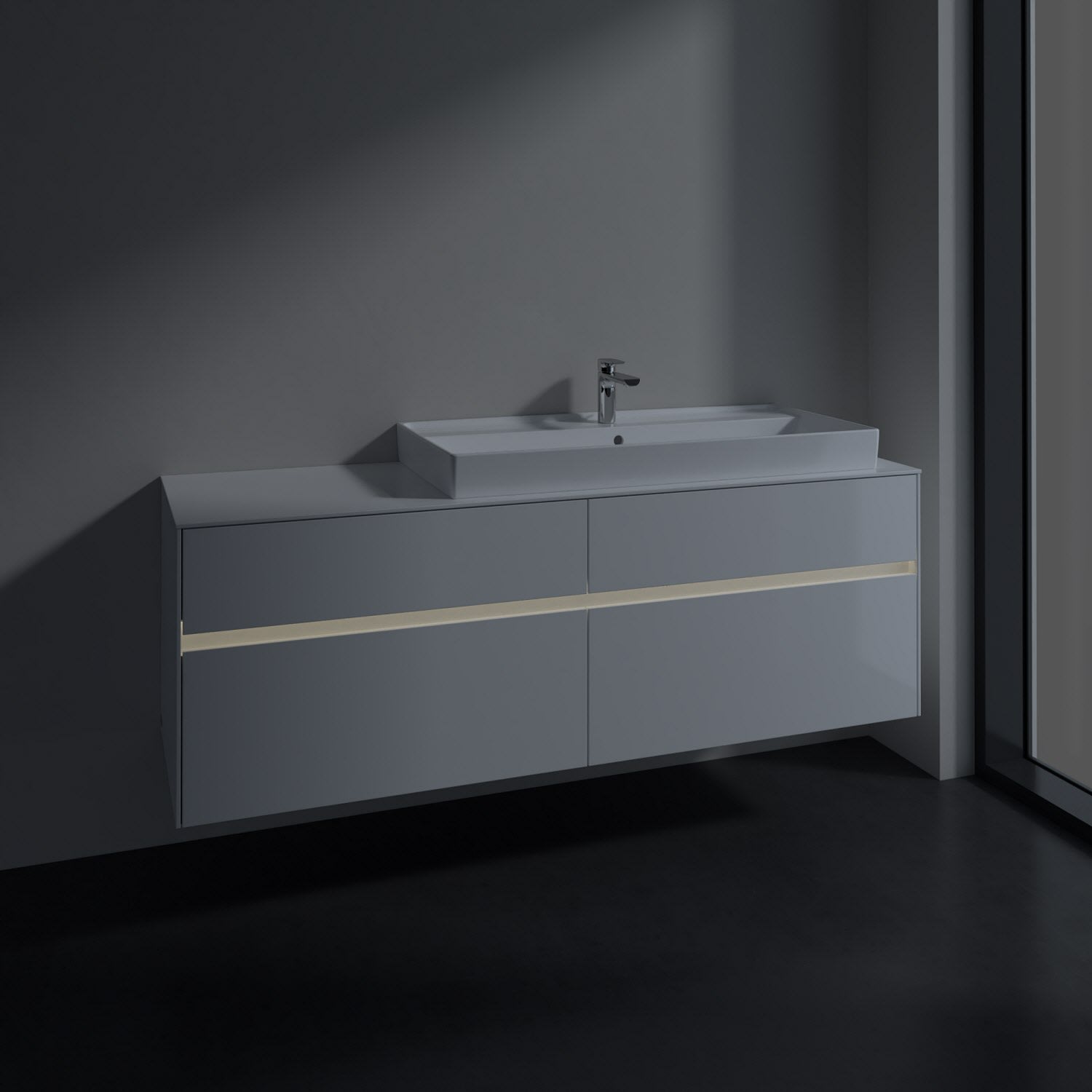 Stauraumwunder im zeitgemäßen Design: Der Villeroy & Boch Waschbeckenunterschrank aus der Collaro Kollektion eignet sich besonders für Familienbäder und bietet genau den Platz, der dort benötigt wird. Eine Griffleiste mit integrierter, stufenlos einstellbarer LED-Beleuchtung sorgt für eine schlichte, stimmungsvolle Front. Steuern lässt sich das Licht über einen Touch-Sensor seitlich am Unterschrank. Im Inneren bietet das Möbelstück mit vier Auszügen erstaunlich viel Komfort – ermöglicht durch großzügiges Platzangebot und integrierte Antirutschmatten. Variabel setzbare Glasabtrennungen und mitgelieferte Accessory Boxen sorgen für den nötigen Überblick. Dank SoftClosing und Selbsteinzug lassen sich die Auszüge nach der Nutzung lautlos schließen.