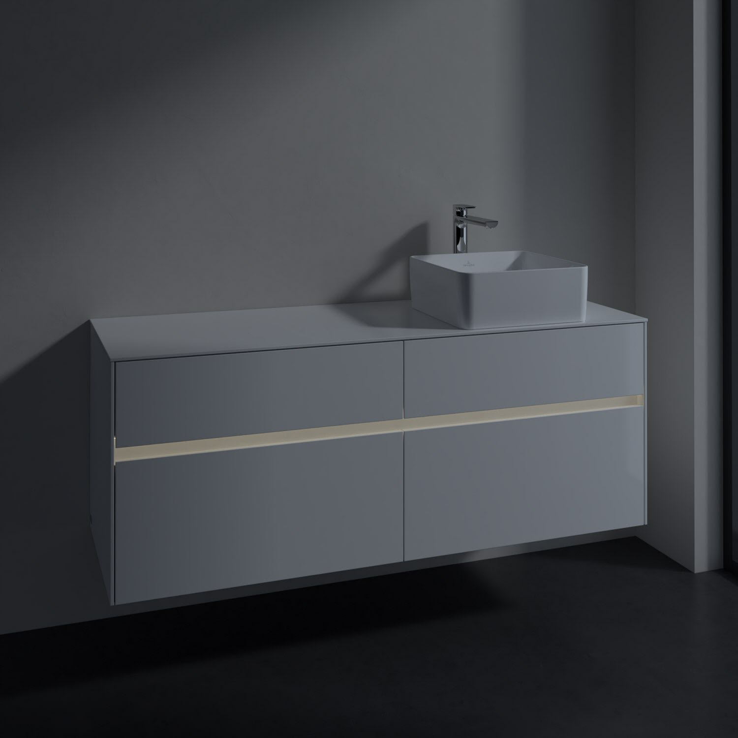 Stauraumwunder im zeitgemäßen Design: Der Villeroy & Boch Waschbeckenunterschrank aus der Collaro Kollektion eignet sich besonders für Familienbäder und bietet genau den Platz, der dort benötigt wird. Eine Griffleiste mit integrierter, stufenlos einstellbarer LED-Beleuchtung sorgt für eine schlichte, stimmungsvolle Front. Steuern lässt sich das Licht über einen Touch-Sensor seitlich am Unterschrank. Im Inneren bietet das Möbelstück mit vier Auszügen erstaunlich viel Komfort – ermöglicht durch großzügiges Platzangebot und integrierte Antirutschmatten. Variabel setzbare Glasabtrennungen und mitgelieferte Accessory Boxen sorgen für den nötigen Überblick. Dank SoftClosing und Selbsteinzug lassen sich die Auszüge nach der Nutzung lautlos schließen.