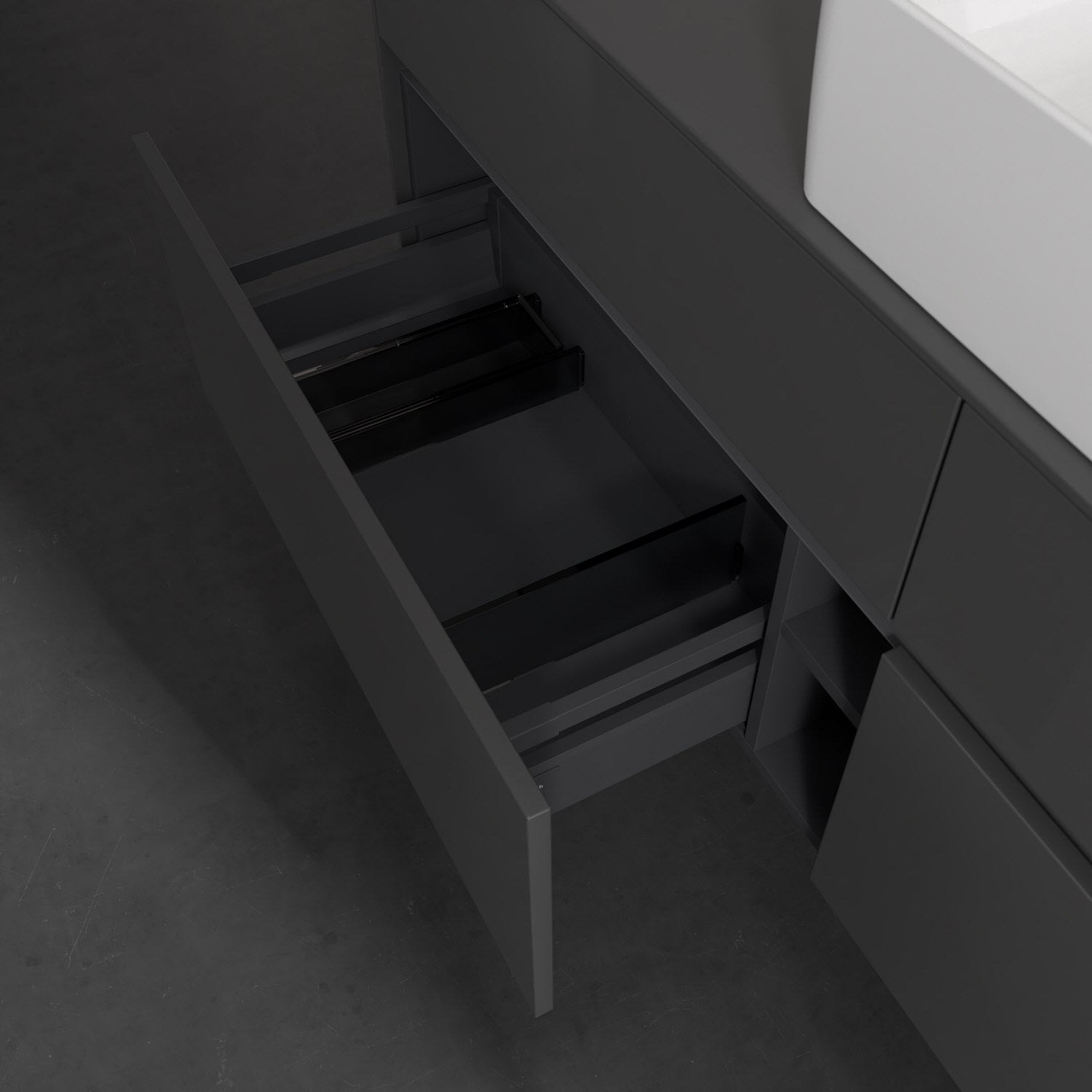 - kein Umfallen oder Verrutschen von Pflegeprodukten in den Schubladen dank rutschhemmendem Boden
