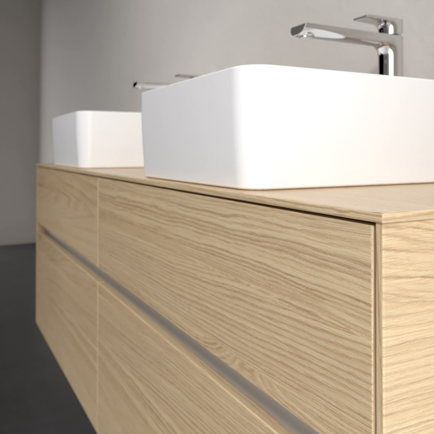 Stauraumwunder im zeitgemäßen Design: Der Villeroy & Boch Waschbeckenunterschrank aus der Collaro Kollektion eignet sich besonders für Familienbäder und bietet genau den Platz, der dort benötigt wird. Eine Griffleiste mit integrierter, stufenlos einstellbarer LED-Beleuchtung sorgt für eine schlichte, stimmungsvolle Front. Steuern lässt sich das Licht über einen Touch-Sensor seitlich am Unterschrank. Im Inneren bietet das Möbelstück mit vier Auszügen erstaunlich viel Komfort – ermöglicht durch großzügiges Platzangebot und integrierte Antirutschmatten. Variabel setzbare Glasabtrennungen und mitgelieferte Accessory Boxen sorgen für den nötigen Überblick. Dank SoftClosing und Selbsteinzug lassen sich die Auszüge nach der Nutzung lautlos schließen.