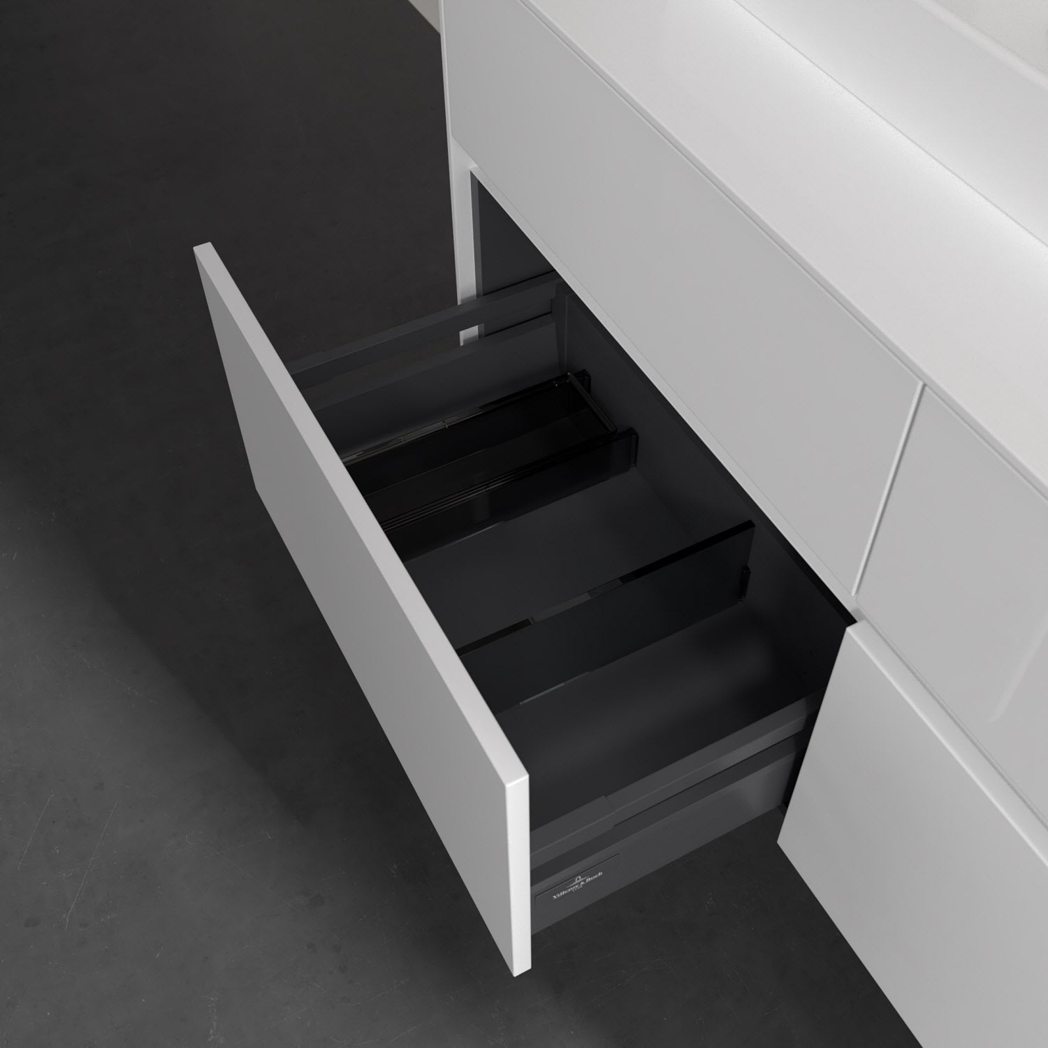 Stauraumwunder im zeitgemäßen Design: Der Villeroy & Boch Waschbeckenunterschrank aus der Collaro Kollektion eignet sich besonders für Familienbäder und bietet genau den Platz, der dort benötigt wird. Eine integrierte Griffleiste sorgt für eine schlichte, moderne Front. Im Inneren bietet das Möbelstück mit vier Auszügen erstaunlich viel Komfort – ermöglicht durch großzügiges Platzangebot und integrierte Antirutschmatten. Variabel setzbare Glasabtrennungen und mitgelieferte Accessory Boxen sorgen für den nötigen Überblick. Dank SoftClosing und Selbsteinzug lassen sich die Auszüge nach der Nutzung lautlos schließen.