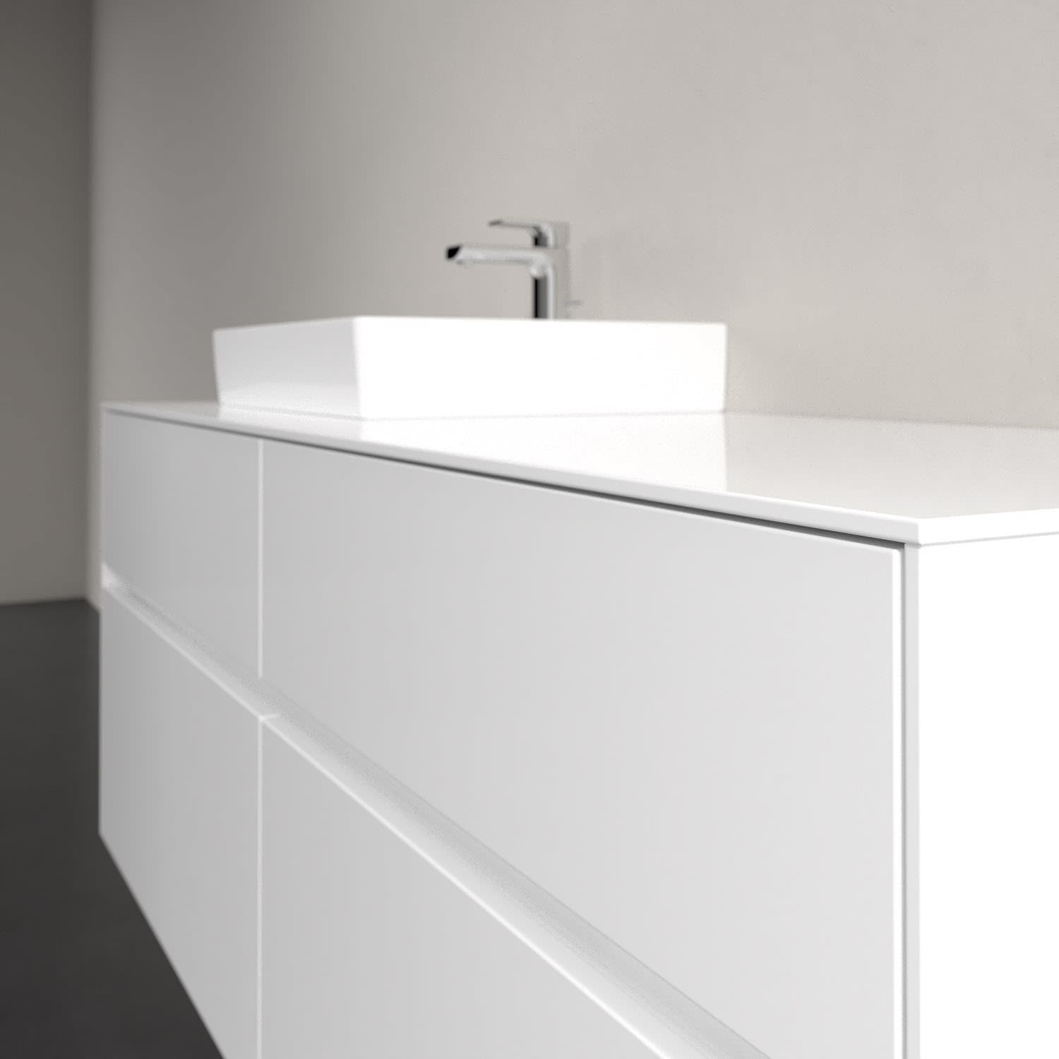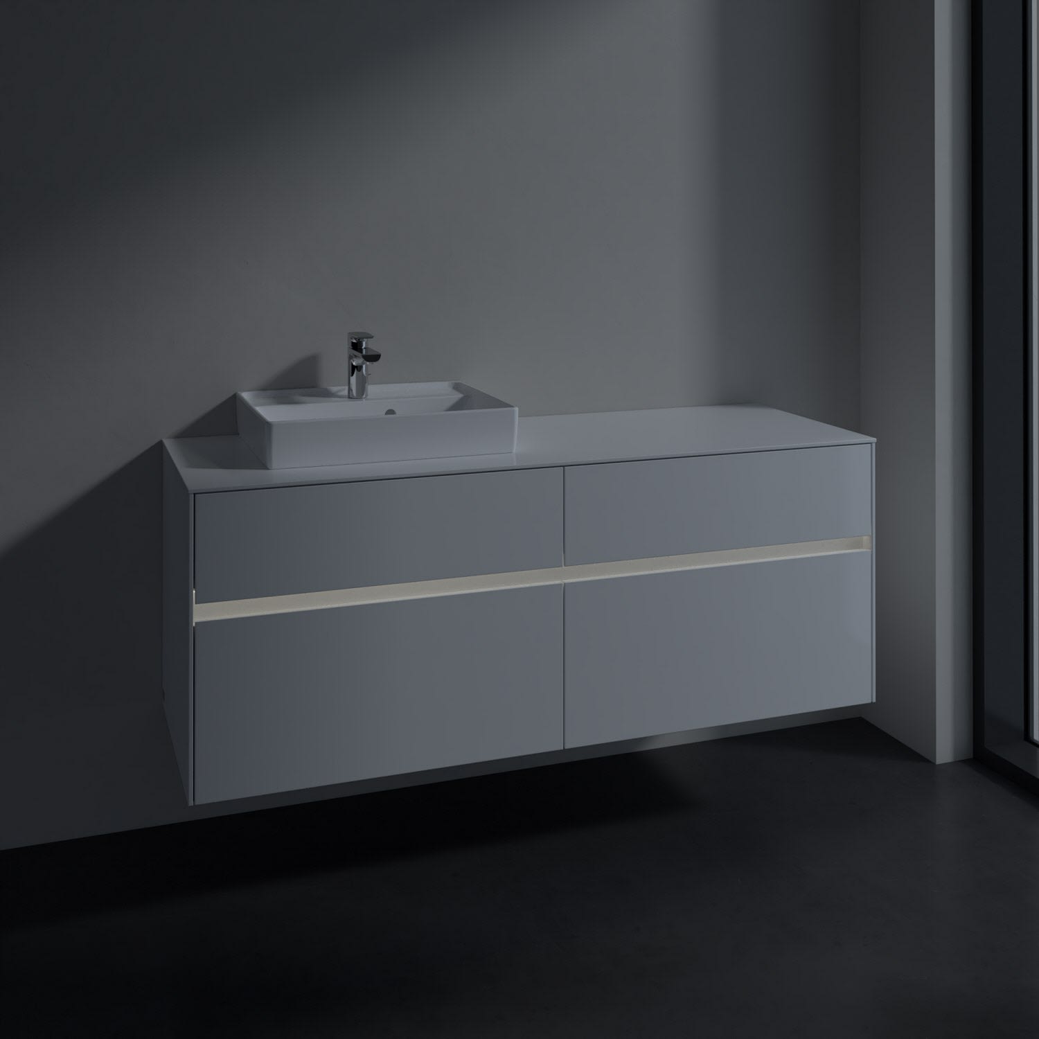 Stauraumwunder im zeitgemäßen Design: Der Villeroy & Boch Waschbeckenunterschrank aus der Collaro Kollektion eignet sich besonders für Familienbäder und bietet genau den Platz, der dort benötigt wird. Eine Griffleiste mit integrierter, stufenlos einstellbarer LED-Beleuchtung sorgt für eine schlichte, stimmungsvolle Front. Steuern lässt sich das Licht über einen Touch-Sensor seitlich am Unterschrank. Im Inneren bietet das Möbelstück mit vier Auszügen erstaunlich viel Komfort – ermöglicht durch großzügiges Platzangebot und integrierte Antirutschmatten. Variabel setzbare Glasabtrennungen und mitgelieferte Accessory Boxen sorgen für den nötigen Überblick. Dank SoftClosing und Selbsteinzug lassen sich die Auszüge nach der Nutzung lautlos schließen.