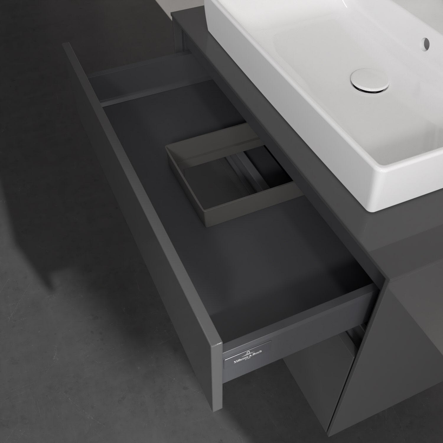 Zeitgemäßes Design und feine Linien: Der Villeroy & Boch Waschbeckenunterschrank aus der Collaro Kollektion mit zwei Auszügen glänzt mit vielen Vorzügen. Eine integrierte Griffleiste sorgt für eine schlichte, moderne Front. Im Inneren bietet das Möbelstück erstaunlich viel Komfort – ermöglicht durch großzügigen Stauraum und integrierte Antirutschmatten. Die variabel setzbaren Glasabtrennungen und die mitgelieferte Accessory Box bieten Badutensilien ausreichend Platz und sorgen für den nötigen Überblick. Dank SoftClosing und Selbsteinzug lassen sich die Auszüge nach der Nutzung lautlos schließen.