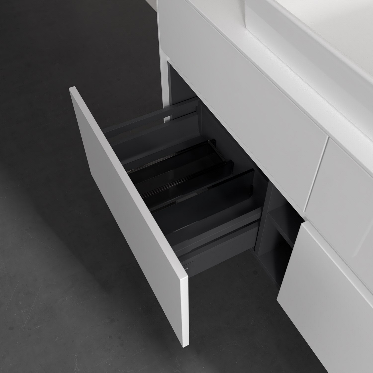 - kein Umfallen oder Verrutschen von Pflegeprodukten in den Schubladen dank rutschhemmendem Boden