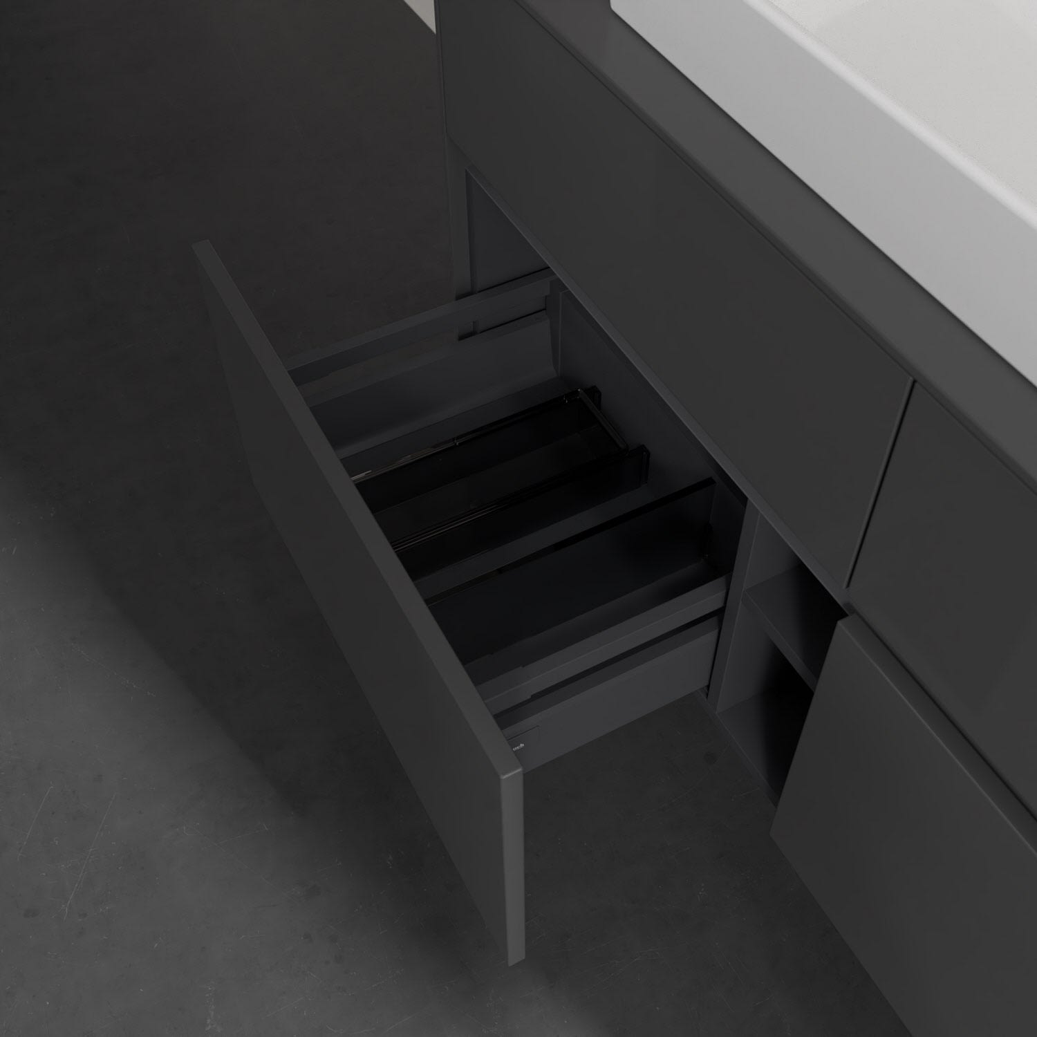 - kein Umfallen oder Verrutschen von Pflegeprodukten in den Schubladen dank rutschhemmendem Boden
