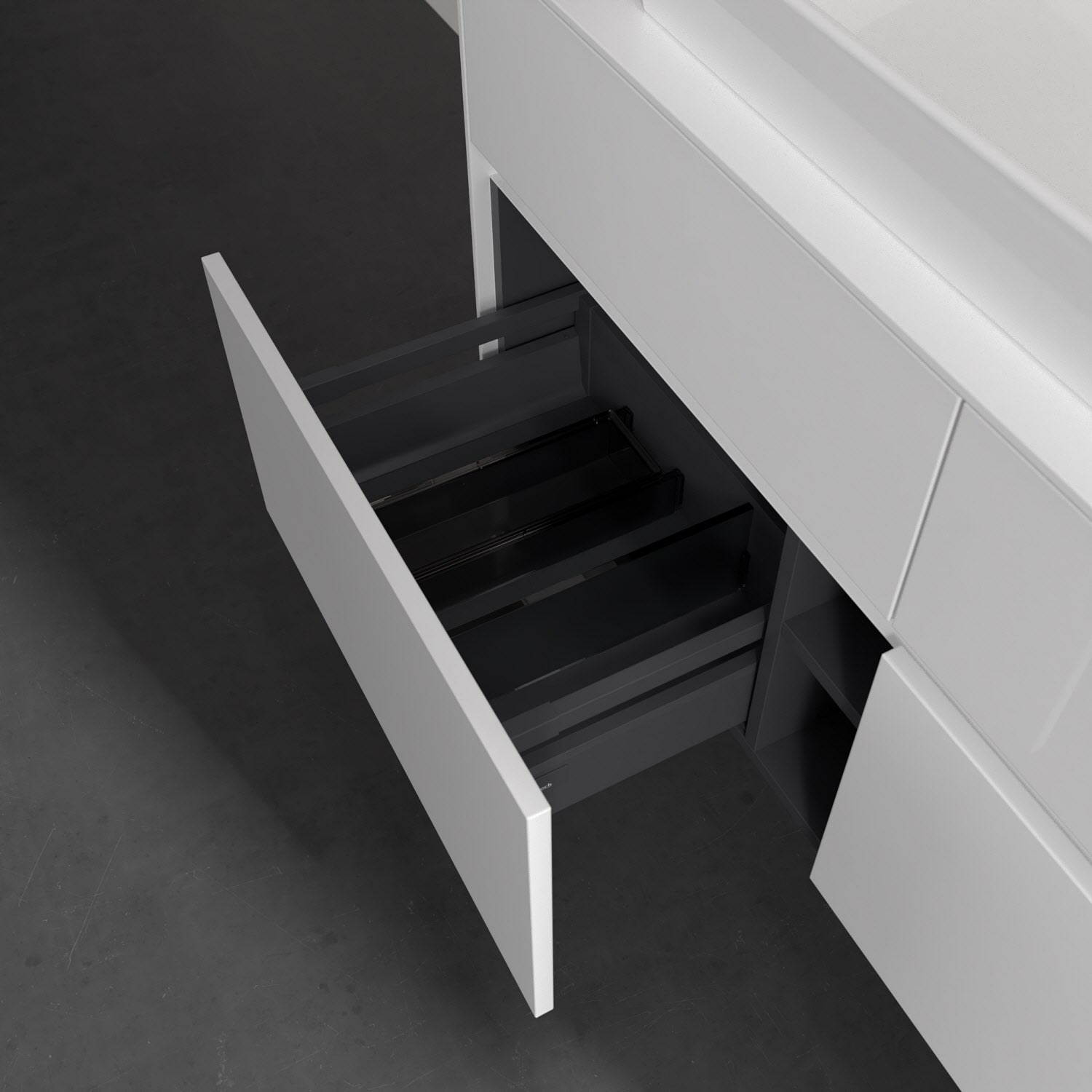 - kein Umfallen oder Verrutschen von Pflegeprodukten in den Schubladen dank rutschhemmendem Boden