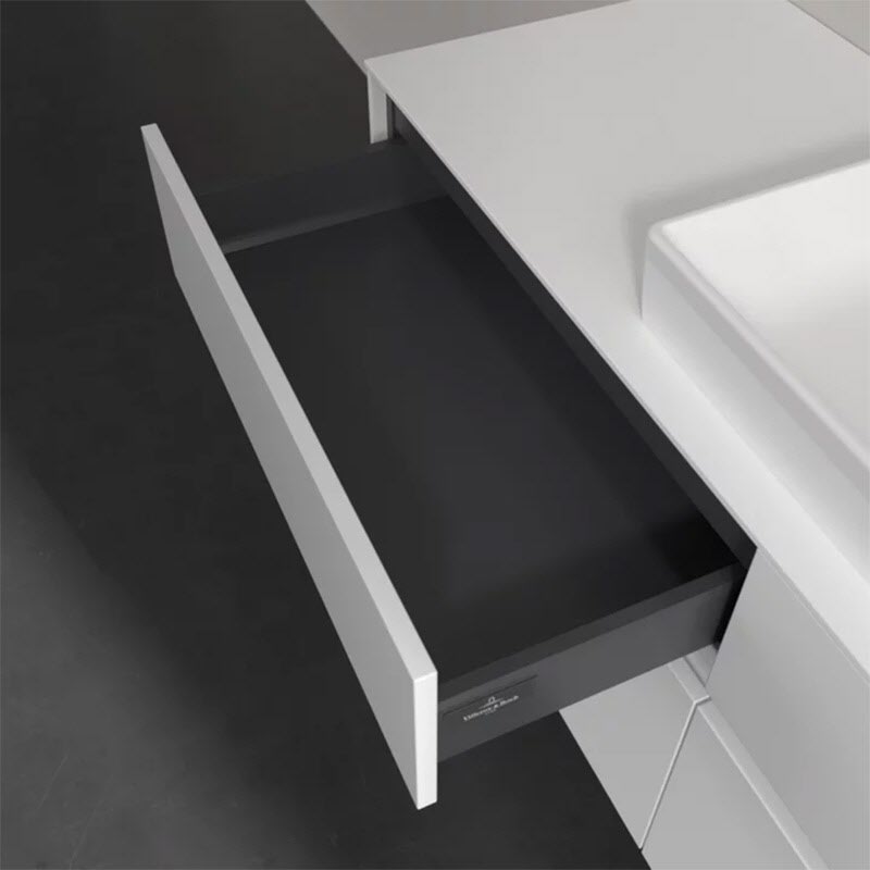 Stauraumwunder im zeitgemäßen Design: Der Villeroy & Boch Waschbeckenunterschrank aus der Collaro Kollektion eignet sich besonders für Familienbäder und bietet genau den Platz, der dort benötigt wird. Eine integrierte Griffleiste sorgt für eine schlichte, moderne Front. Im Inneren bietet das Möbelstück mit vier Auszügen erstaunlich viel Komfort – ermöglicht durch großzügiges Platzangebot und integrierte Antirutschmatten. Variabel setzbare Glasabtrennungen und mitgelieferte Accessory Boxen sorgen für den nötigen Überblick. Dank SoftClosing und Selbsteinzug lassen sich die Auszüge nach der Nutzung lautlos schließen.