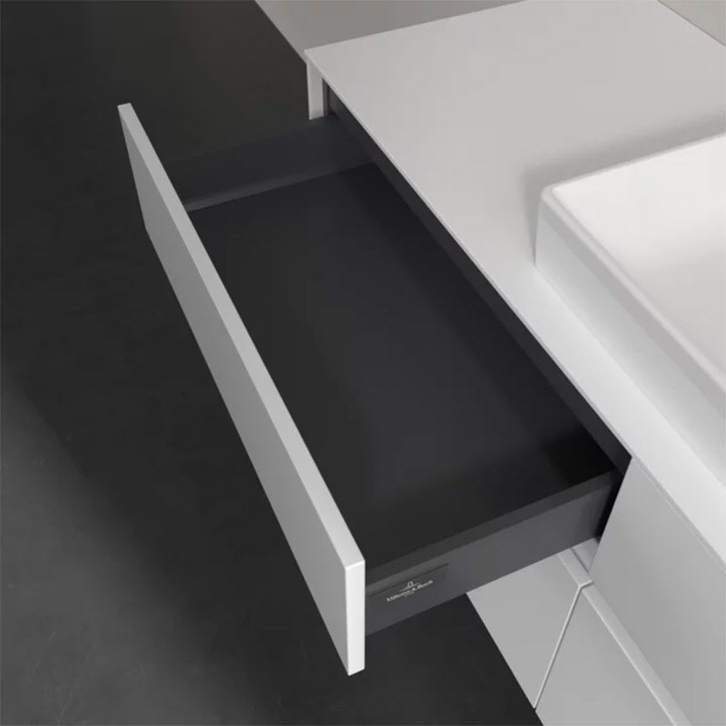 Stauraumwunder im zeitgemäßen Design: Der Villeroy & Boch Waschbeckenunterschrank aus der Collaro Kollektion eignet sich besonders für Familienbäder und bietet genau den Platz, der dort benötigt wird. Eine Griffleiste mit integrierter, stufenlos einstellbarer LED-Beleuchtung sorgt für eine schlichte, stimmungsvolle Front. Steuern lässt sich das Licht über einen Touch-Sensor seitlich am Unterschrank. Im Inneren bietet das Möbelstück mit vier Auszügen erstaunlich viel Komfort – ermöglicht durch großzügiges Platzangebot und integrierte Antirutschmatten. Variabel setzbare Glasabtrennungen und mitgelieferte Accessory Boxen sorgen für den nötigen Überblick. Dank SoftClosing und Selbsteinzug lassen sich die Auszüge nach der Nutzung lautlos schließen.