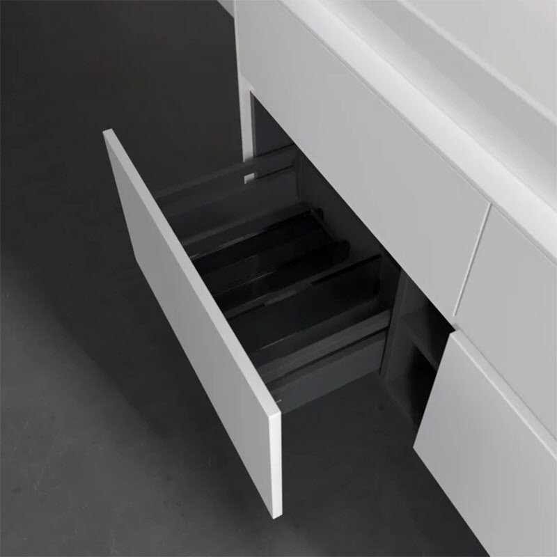 Stauraumwunder im zeitgemäßen Design: Der Villeroy & Boch Waschbeckenunterschrank aus der Collaro Kollektion eignet sich besonders für Familienbäder und bietet genau den Platz, der dort benötigt wird. Eine integrierte Griffleiste sorgt für eine schlichte, moderne Front. Im Inneren bietet das Möbelstück mit vier Auszügen erstaunlich viel Komfort – ermöglicht durch großzügiges Platzangebot und integrierte Antirutschmatten. Variabel setzbare Glasabtrennungen und mitgelieferte Accessory Boxen sorgen für den nötigen Überblick. Dank SoftClosing und Selbsteinzug lassen sich die Auszüge nach der Nutzung lautlos schließen.