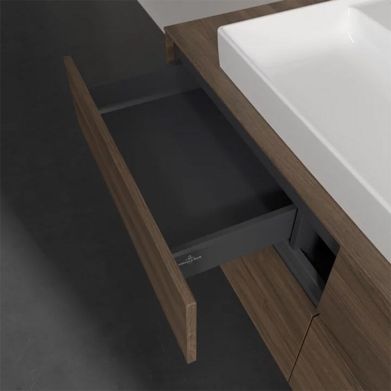 Stauraumwunder im zeitgemäßen Design: Der Villeroy & Boch Waschbeckenunterschrank aus der Collaro Kollektion eignet sich besonders für Familienbäder und bietet genau den Platz, der dort benötigt wird. Eine integrierte Griffleiste sorgt für eine schlichte, moderne Front. Im Inneren bietet das Möbelstück mit vier Auszügen erstaunlich viel Komfort – ermöglicht durch großzügiges Platzangebot und integrierte Antirutschmatten. Variabel setzbare Glasabtrennungen und mitgelieferte Accessory Boxen sorgen für den nötigen Überblick. Dank SoftClosing und Selbsteinzug lassen sich die Auszüge nach der Nutzung lautlos schließen.