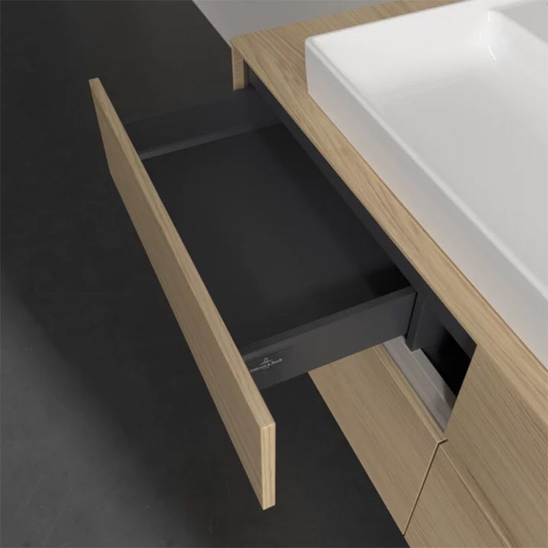 Stauraumwunder im zeitgemäßen Design: Der Villeroy & Boch Waschbeckenunterschrank aus der Collaro Kollektion eignet sich besonders für Familienbäder und bietet genau den Platz, der dort benötigt wird. Eine integrierte Griffleiste sorgt für eine schlichte, moderne Front. Im Inneren bietet das Möbelstück mit vier Auszügen erstaunlich viel Komfort – ermöglicht durch großzügiges Platzangebot und integrierte Antirutschmatten. Variabel setzbare Glasabtrennungen und mitgelieferte Accessory Boxen sorgen für den nötigen Überblick. Dank SoftClosing und Selbsteinzug lassen sich die Auszüge nach der Nutzung lautlos schließen.