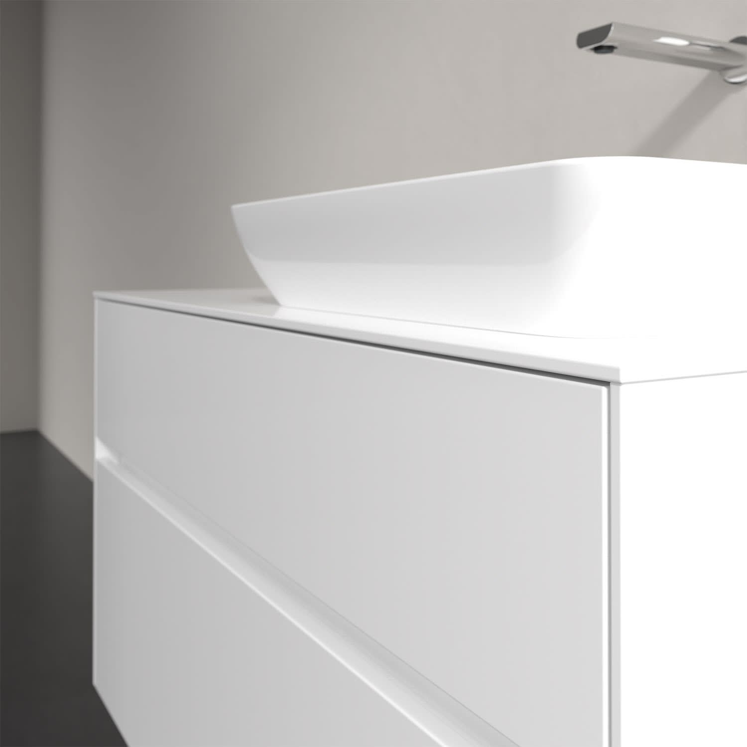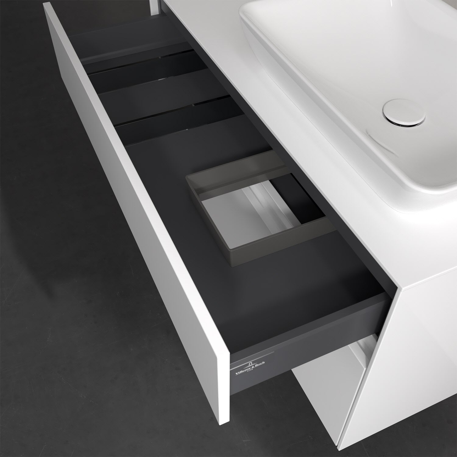Zeitgemäßes Design und feine Linien: Der Villeroy & Boch Waschbeckenunterschrank aus der Collaro Kollektion mit zwei Auszügen glänzt mit vielen Vorzügen. Eine Griffleiste mit integrierter, stufenlos einstellbarer LED-Beleuchtung sorgt für eine schlichte, stimmungsvolle Front. Steuern lässt sich das Licht über einen Touch-Sensor seitlich am Unterschrank. Im Inneren bietet das Möbelstück erstaunlich viel Komfort – ermöglicht durch großzügigen Stauraum und den integrierten Antirutschboden. Die variabel setzbaren Glasabtrennungen und die mitgelieferte Accessory Box bieten Badutensilien ausreichend Platz und sorgen für den nötigen Überblick. Dank SoftClosing und Selbsteinzug lassen sich die Auszüge nach der Nutzung lautlos schließen. Für eine besonders leichte Pflege sorgt die widerstandsfähige Acryloberfläche.