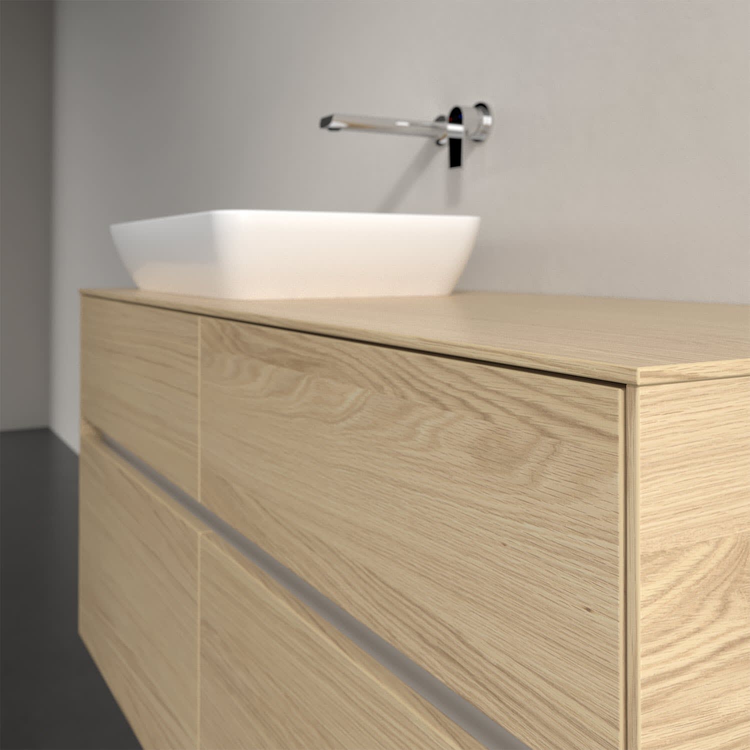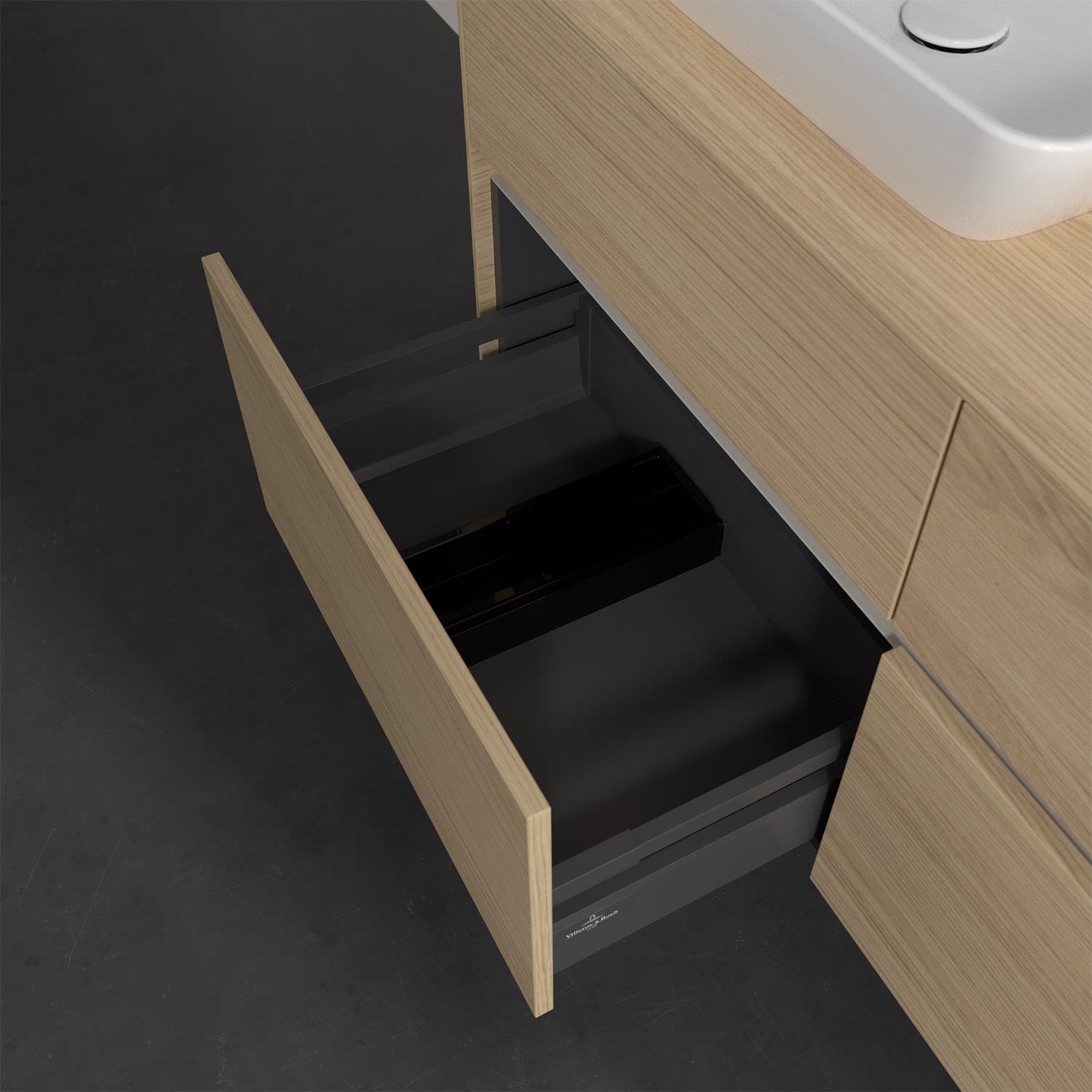 Stauraumwunder im zeitgemäßen Design: Der Villeroy & Boch Waschbeckenunterschrank aus der Collaro Kollektion eignet sich besonders für Familienbäder und bietet genau den Platz, der dort benötigt wird. Stimmungsvolles Highlight der schlichten, modernen Front ist die integrierte Griffmulde mit stufenlos einstellbarer LED-Beleuchtung. Im Inneren bietet das Möbelstück mit vier Auszügen erstaunlich viel Komfort – ermöglicht durch großzügiges Platzangebot und den integrierten Antirutschboden. Variabel setzbare Glasabtrennungen und mitgelieferte Accessory Boxen sorgen für den nötigen Überblick. Dank SoftClosing und Selbsteinzug lassen sich die Auszüge nach der Nutzung lautlos schließen. Für eine besonders leichte Reinigung sorgt die pflegeleichte Direktbeschichtung.