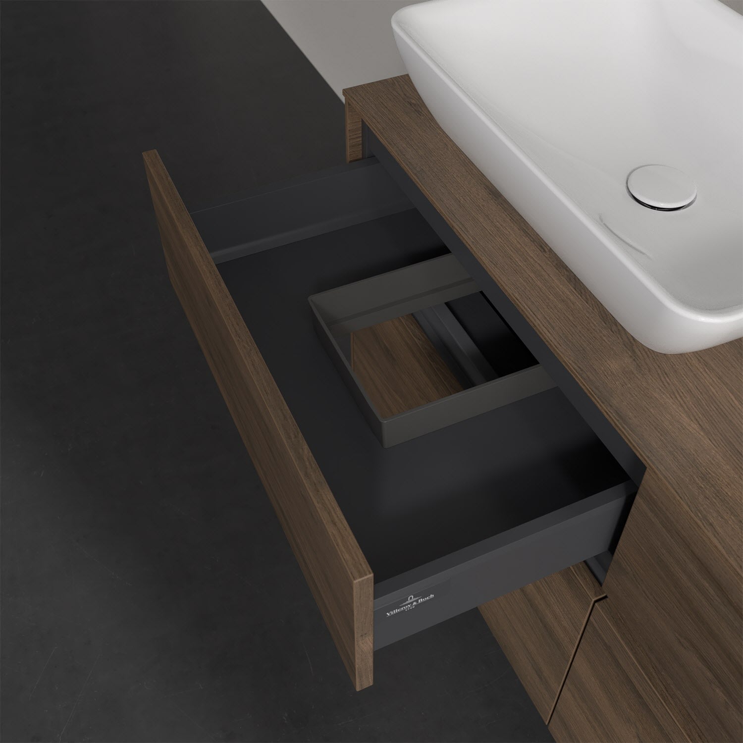 Stauraumwunder im zeitgemäßen Design: Der Villeroy & Boch Waschbeckenunterschrank aus der Collaro Kollektion eignet sich besonders für Familienbäder und bietet genau den Platz, der dort benötigt wird. Eine integrierte Griffleiste sorgt für eine schlichte, moderne Front. Steuern lässt sich das Licht über einen Touch-Sensor seitlich am Unterschrank. Im Inneren bietet das Möbelstück mit vier Auszügen erstaunlich viel Komfort – ermöglicht durch großzügiges Platzangebot und den integrierten Antirutschboden. Variabel setzbare Glasabtrennungen und mitgelieferte Accessory Boxen sorgen für den nötigen Überblick. Dank SoftClosing und Selbsteinzug lassen sich die Auszüge nach der Nutzung lautlos schließen. Für eine besonders leichte Reinigung sorgt die pflegeleichte Direktbeschichtung.