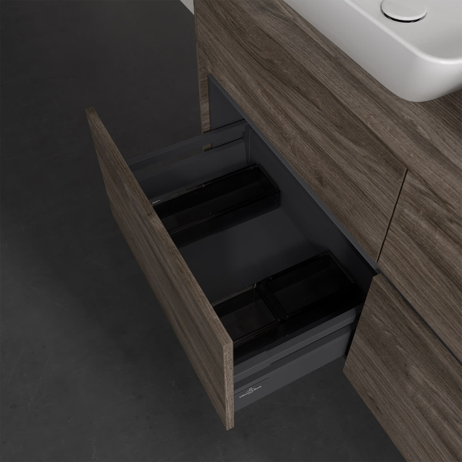 Stauraumwunder im zeitgemäßen Design: Der Villeroy & Boch Waschbeckenunterschrank aus der Collaro Kollektion eignet sich besonders für Familienbäder und bietet genau den Platz, der dort benötigt wird. Stimmungsvolles Highlight der schlichten, modernen Front ist die integrierte Griffmulde mit stufenlos einstellbarer LED-Beleuchtung. Im Inneren bietet das Möbelstück mit vier Auszügen erstaunlich viel Komfort – ermöglicht durch großzügiges Platzangebot und den integrierten Antirutschboden. Variabel setzbare Glasabtrennungen und mitgelieferte Accessory Boxen sorgen für den nötigen Überblick. Dank SoftClosing und Selbsteinzug lassen sich die Auszüge nach der Nutzung lautlos schließen. Für eine besonders leichte Reinigung sorgt die pflegeleichte Direktbeschichtung.