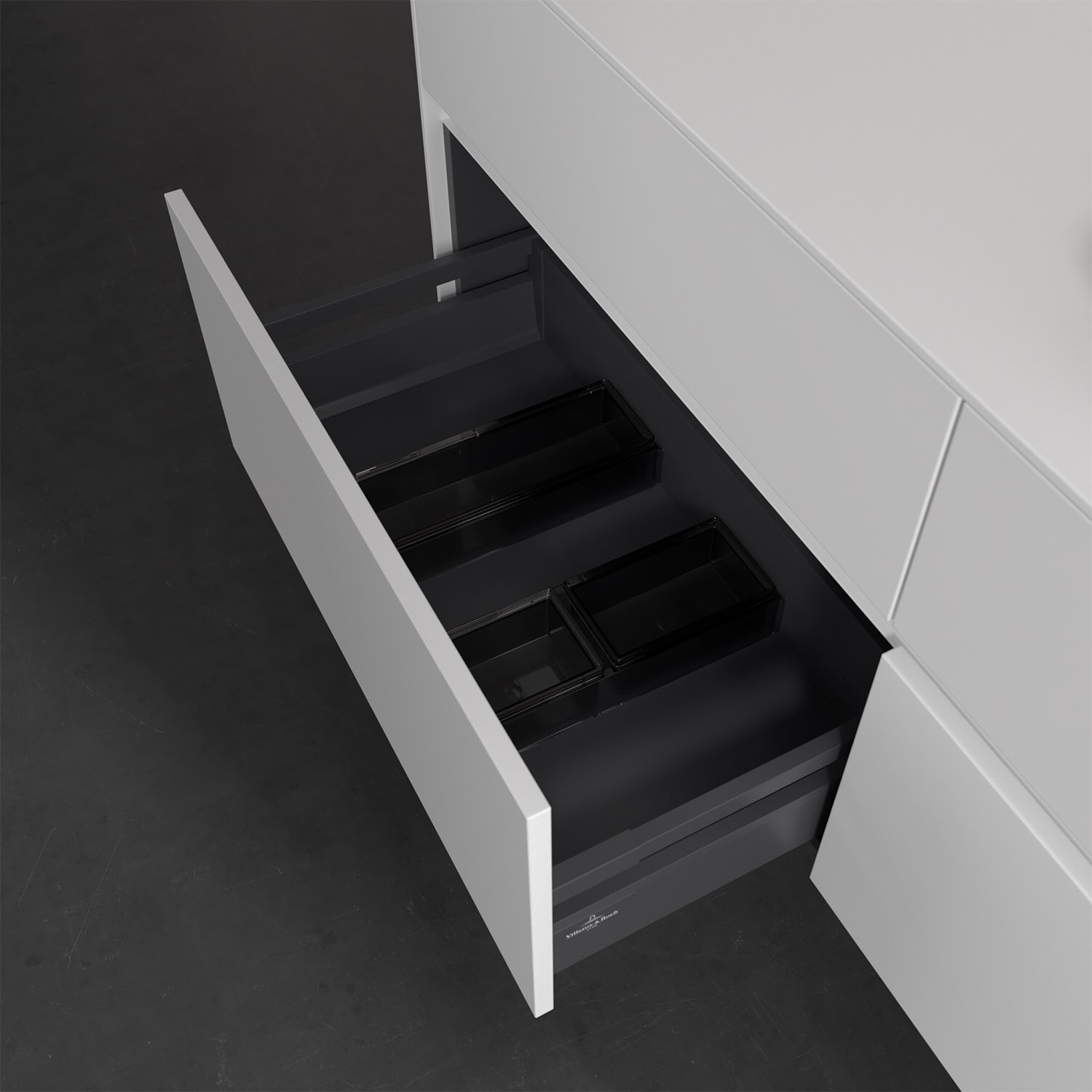 Stauraumwunder im zeitgemäßen Design: Der Villeroy & Boch Waschbeckenunterschrank aus der Collaro Kollektion eignet sich besonders für Familienbäder und bietet genau den Platz, der dort benötigt wird. Eine integrierte Griffleiste sorgt für eine schlichte, moderne Front. Im Inneren bietet das Möbelstück mit vier Auszügen erstaunlich viel Komfort – ermöglicht durch großzügiges Platzangebot und den integrierten Antirutschboden. Variabel setzbare Glasabtrennungen und mitgelieferte Accessory Boxen sorgen für den nötigen Überblick. Dank SoftClosing und Selbsteinzug lassen sich die Auszüge nach der Nutzung lautlos schließen. Für eine besonders leichte Reinigung sorgt die pflegeleichte Direktbeschichtung.
