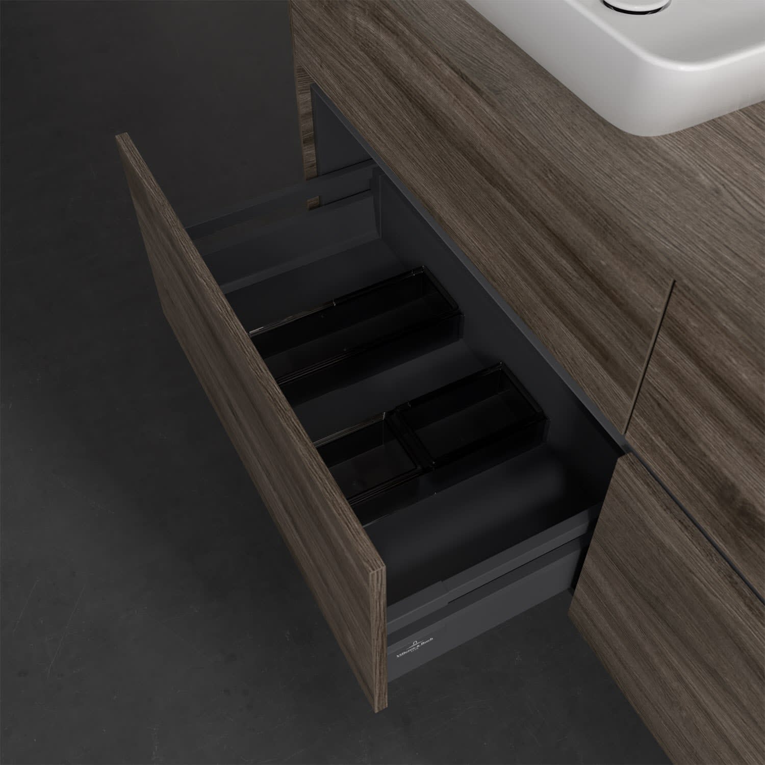 Stauraumwunder im zeitgemäßen Design: Der Villeroy & Boch Waschbeckenunterschrank aus der Collaro Kollektion eignet sich besonders für Familienbäder und bietet genau den Platz, der dort benötigt wird. Eine integrierte Griffleiste sorgt für eine schlichte, moderne Front. Steuern lässt sich das Licht über einen Touch-Sensor seitlich am Unterschrank. Im Inneren bietet das Möbelstück mit vier Auszügen erstaunlich viel Komfort – ermöglicht durch großzügiges Platzangebot und den integrierten Antirutschboden. Variabel setzbare Glasabtrennungen und mitgelieferte Accessory Boxen sorgen für den nötigen Überblick. Dank SoftClosing und Selbsteinzug lassen sich die Auszüge nach der Nutzung lautlos schließen. Für eine besonders leichte Reinigung sorgt die pflegeleichte Direktbeschichtung.