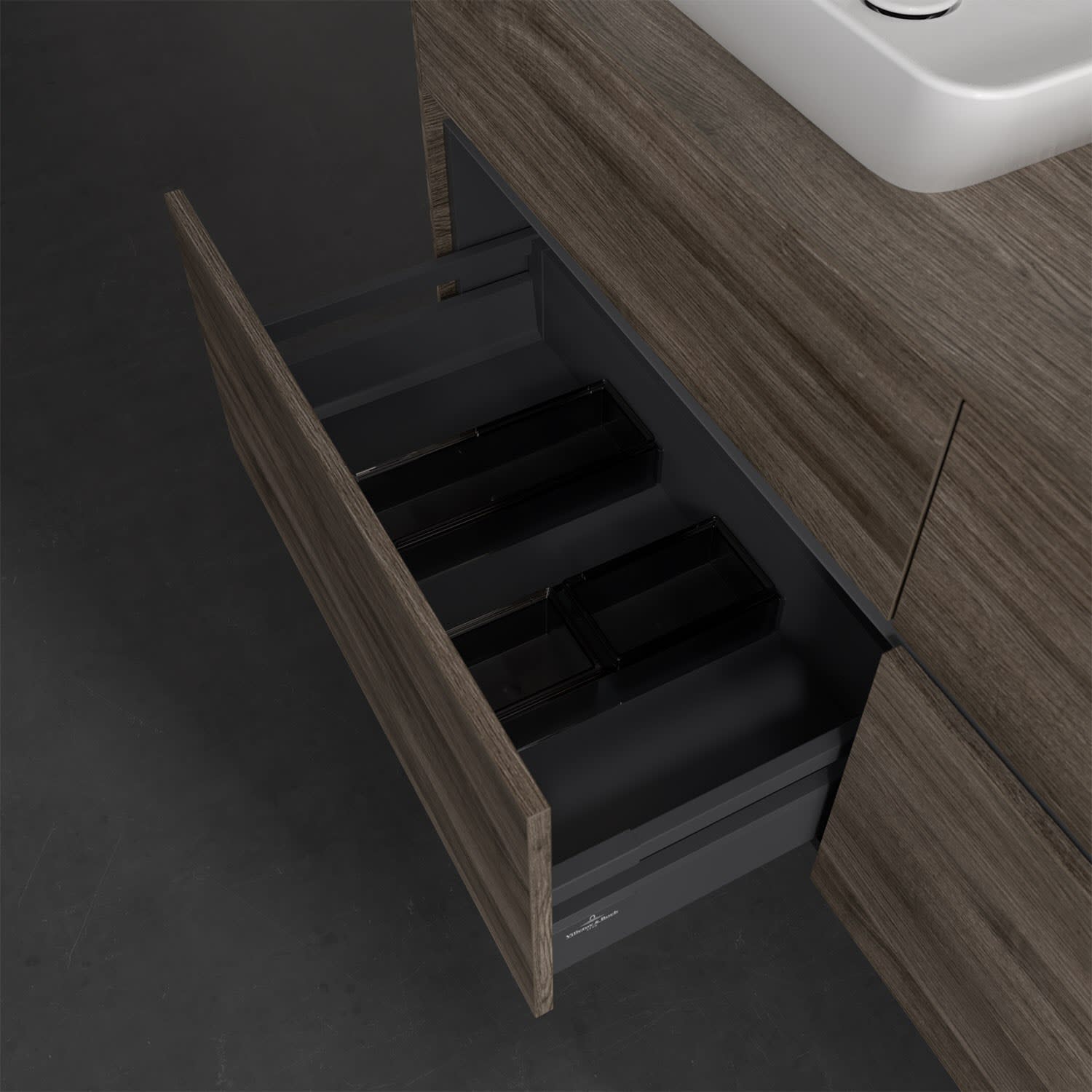 Stauraumwunder im zeitgemäßen Design: Der Villeroy & Boch Waschbeckenunterschrank aus der Collaro Kollektion eignet sich besonders für Familienbäder und bietet genau den Platz, der dort benötigt wird. Eine integrierte Griffleiste sorgt für eine schlichte, moderne Front. Im Inneren bietet das Möbelstück mit vier Auszügen erstaunlich viel Komfort – ermöglicht durch großzügiges Platzangebot und den integrierten Antirutschboden. Variabel setzbare Glasabtrennungen und mitgelieferte Accessory Boxen sorgen für den nötigen Überblick. Dank SoftClosing und Selbsteinzug lassen sich die Auszüge nach der Nutzung lautlos schließen. Für eine besonders leichte Reinigung sorgt die pflegeleichte Direktbeschichtung.
