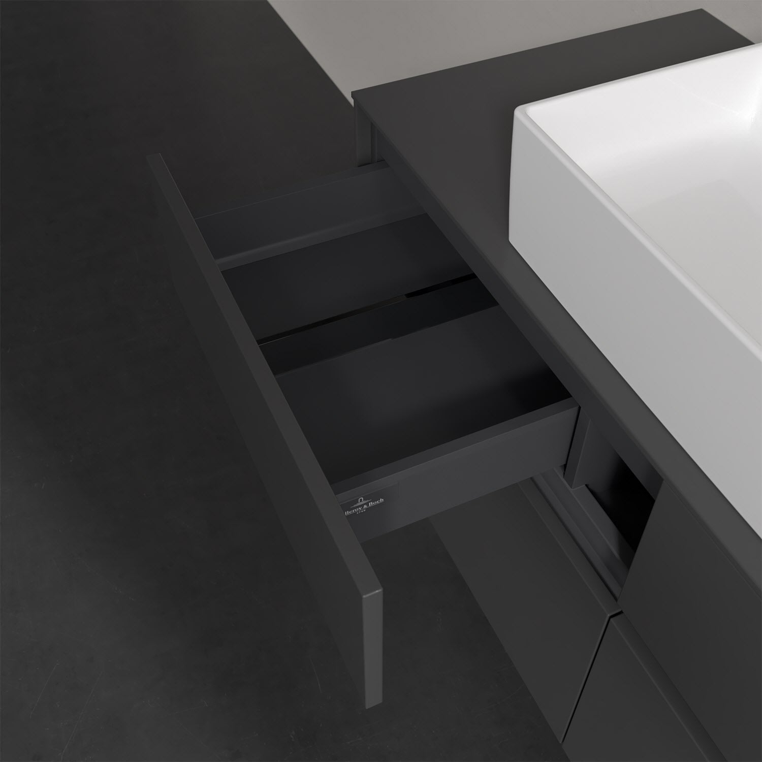 Stauraumwunder im zeitgemäßen Design: Der Villeroy & Boch Waschbeckenunterschrank aus der Collaro Kollektion eignet sich besonders für Familienbäder und bietet genau den Platz, der dort benötigt wird. Eine integrierte Griffleiste sorgt für eine schlichte, moderne Front. Steuern lässt sich das Licht über einen Touch-Sensor seitlich am Unterschrank. Im Inneren bietet das Möbelstück mit vier Auszügen erstaunlich viel Komfort – ermöglicht durch großzügiges Platzangebot und den integrierten Antirutschboden. Variabel setzbare Glasabtrennungen und mitgelieferte Accessory Boxen sorgen für den nötigen Überblick. Dank SoftClosing und Selbsteinzug lassen sich die Auszüge nach der Nutzung lautlos schließen. Für eine besonders leichte Pflege sorgt die widerstandsfähige Acryloberfläche.