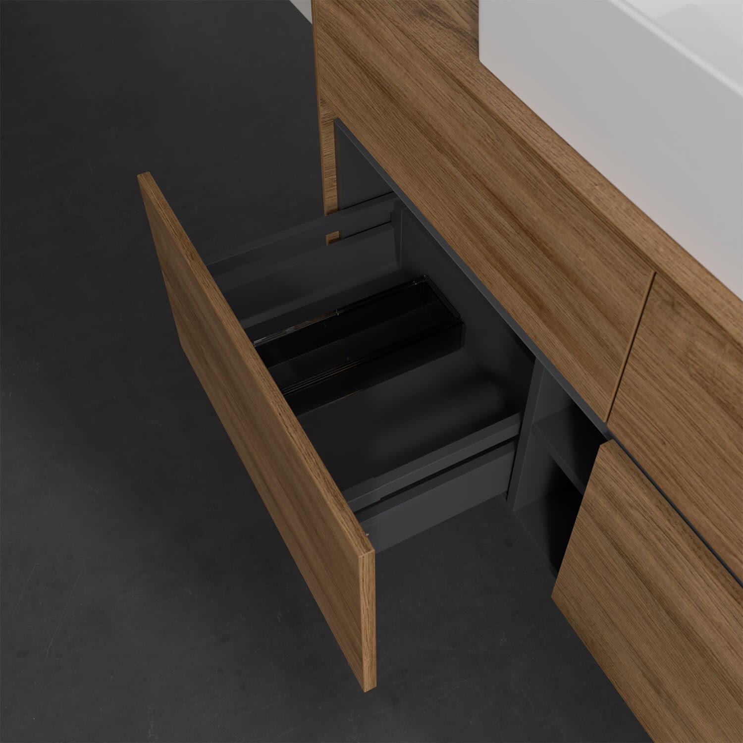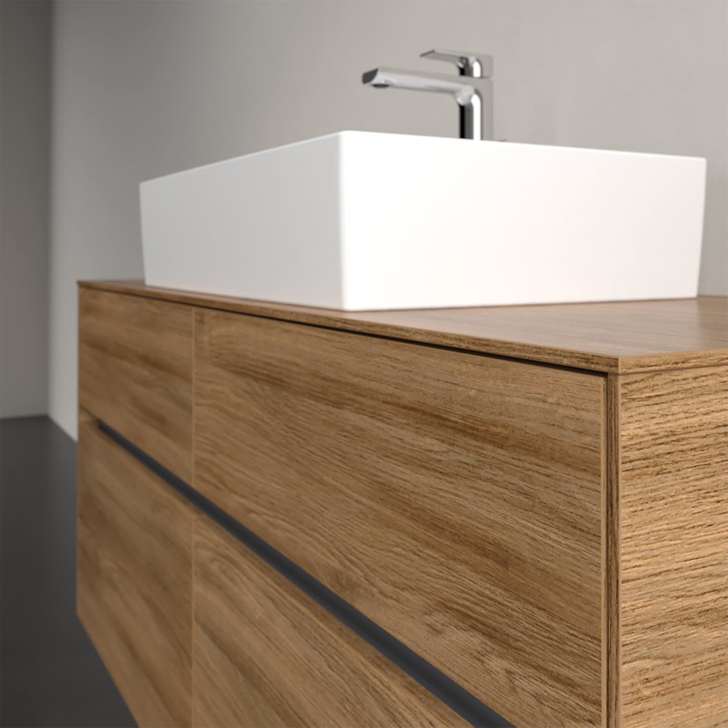 Stauraumwunder im zeitgemäßen Design: Der Villeroy & Boch Waschbeckenunterschrank aus der Collaro Kollektion eignet sich besonders für Familienbäder und bietet genau den Platz, der dort benötigt wird. Eine integrierte Griffleiste sorgt für eine schlichte, moderne Front. Steuern lässt sich das Licht über einen Touch-Sensor seitlich am Unterschrank. Im Inneren bietet das Möbelstück mit vier Auszügen erstaunlich viel Komfort – ermöglicht durch großzügiges Platzangebot und den integrierten Antirutschboden. Variabel setzbare Glasabtrennungen und mitgelieferte Accessory Boxen sorgen für den nötigen Überblick. Dank SoftClosing und Selbsteinzug lassen sich die Auszüge nach der Nutzung lautlos schließen. Für eine besonders leichte Reinigung sorgt die pflegeleichte Direktbeschichtung.