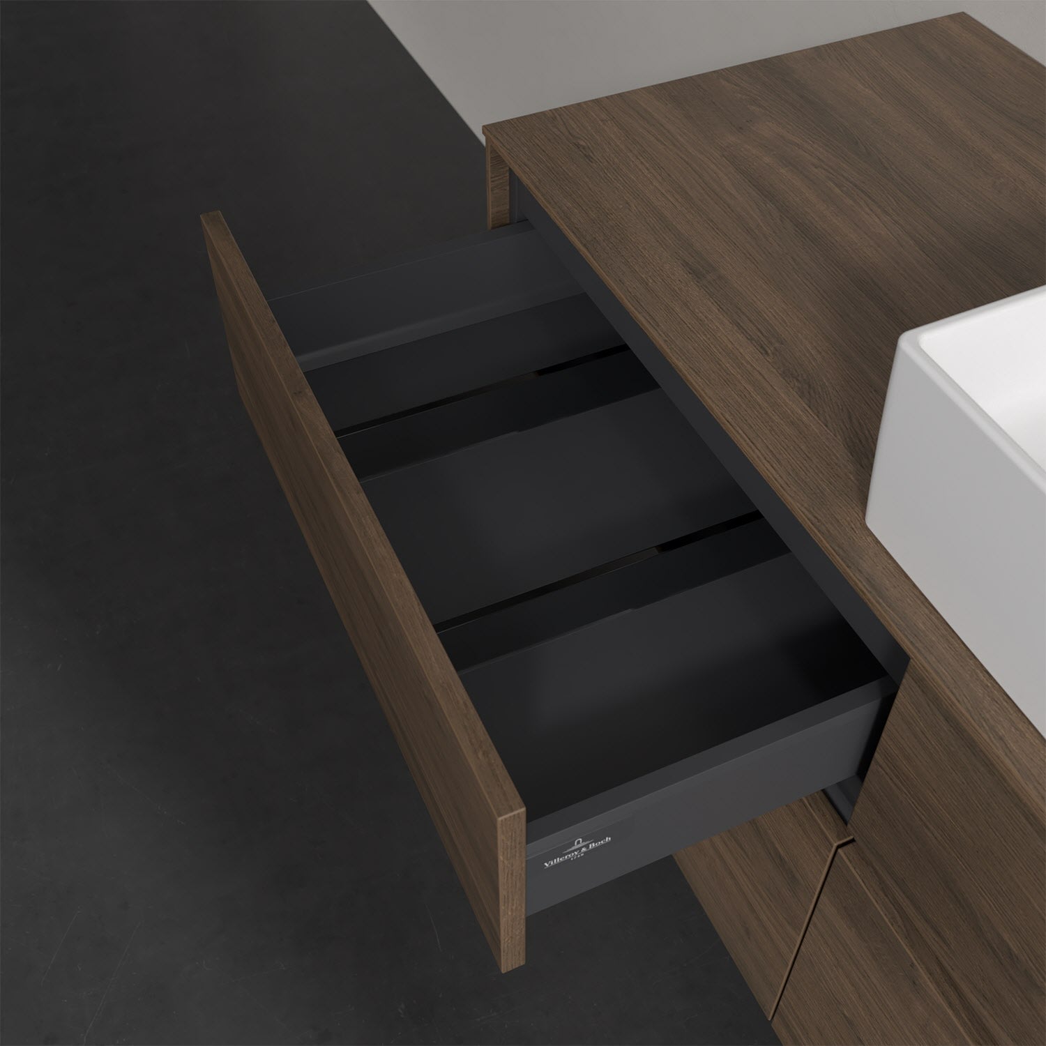 Stauraumwunder im zeitgemäßen Design: Der Villeroy & Boch Waschbeckenunterschrank aus der Collaro Kollektion eignet sich besonders für Familienbäder und bietet genau den Platz, der dort benötigt wird. Eine integrierte Griffleiste sorgt für eine schlichte, moderne Front. Steuern lässt sich das Licht über einen Touch-Sensor seitlich am Unterschrank. Im Inneren bietet das Möbelstück mit vier Auszügen erstaunlich viel Komfort – ermöglicht durch großzügiges Platzangebot und den integrierten Antirutschboden. Variabel setzbare Glasabtrennungen und mitgelieferte Accessory Boxen sorgen für den nötigen Überblick. Dank SoftClosing und Selbsteinzug lassen sich die Auszüge nach der Nutzung lautlos schließen. Für eine besonders leichte Reinigung sorgt die pflegeleichte Direktbeschichtung.
