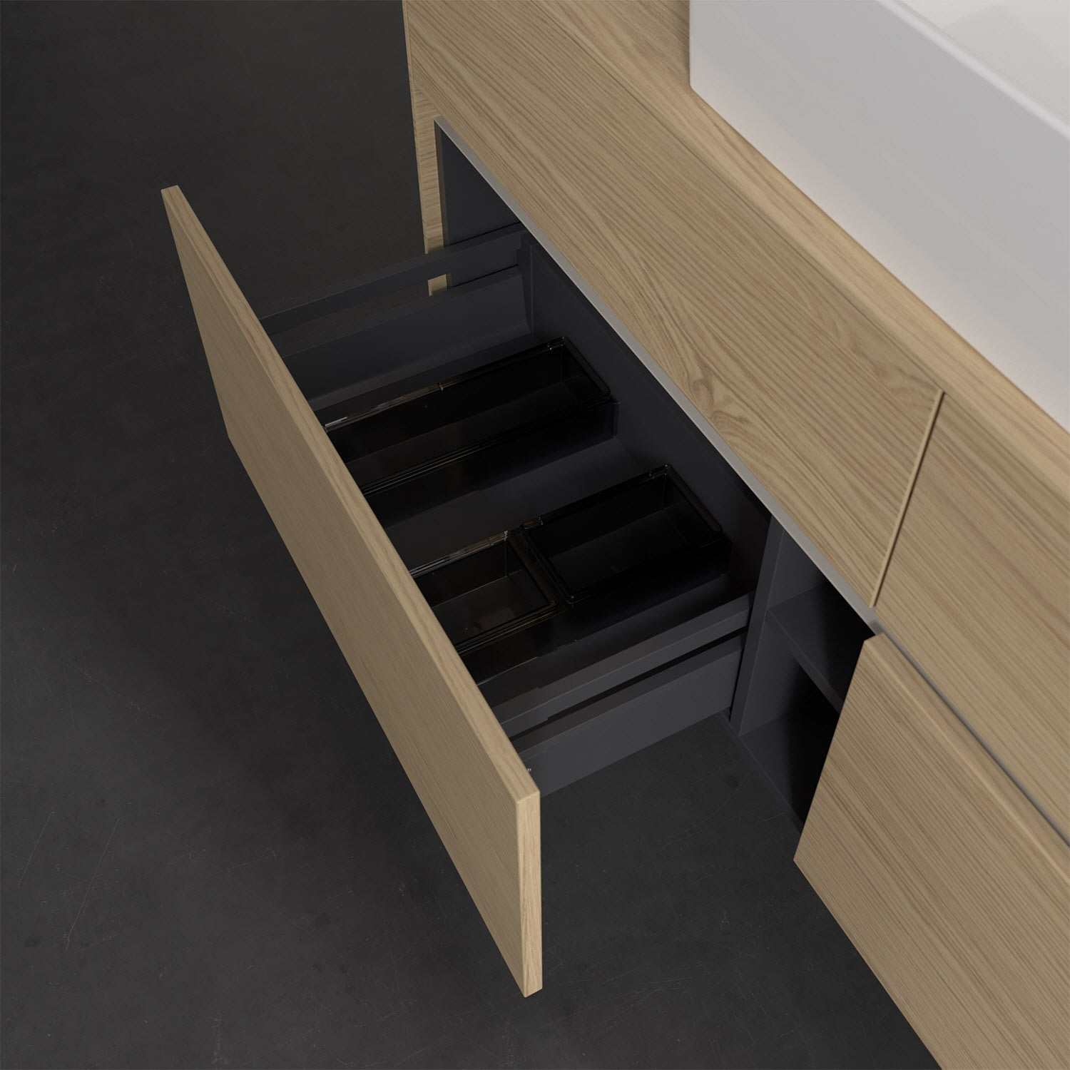Stauraumwunder im zeitgemäßen Design: Der Villeroy & Boch Waschbeckenunterschrank aus der Collaro Kollektion eignet sich besonders für Familienbäder und bietet genau den Platz, der dort benötigt wird. Eine integrierte Griffleiste sorgt für eine schlichte, moderne Front. Steuern lässt sich das Licht über einen Touch-Sensor seitlich am Unterschrank. Im Inneren bietet das Möbelstück mit vier Auszügen erstaunlich viel Komfort – ermöglicht durch großzügiges Platzangebot und den integrierten Antirutschboden. Variabel setzbare Glasabtrennungen und mitgelieferte Accessory Boxen sorgen für den nötigen Überblick. Dank SoftClosing und Selbsteinzug lassen sich die Auszüge nach der Nutzung lautlos schließen. Für eine besonders leichte Reinigung sorgt die pflegeleichte Direktbeschichtung.