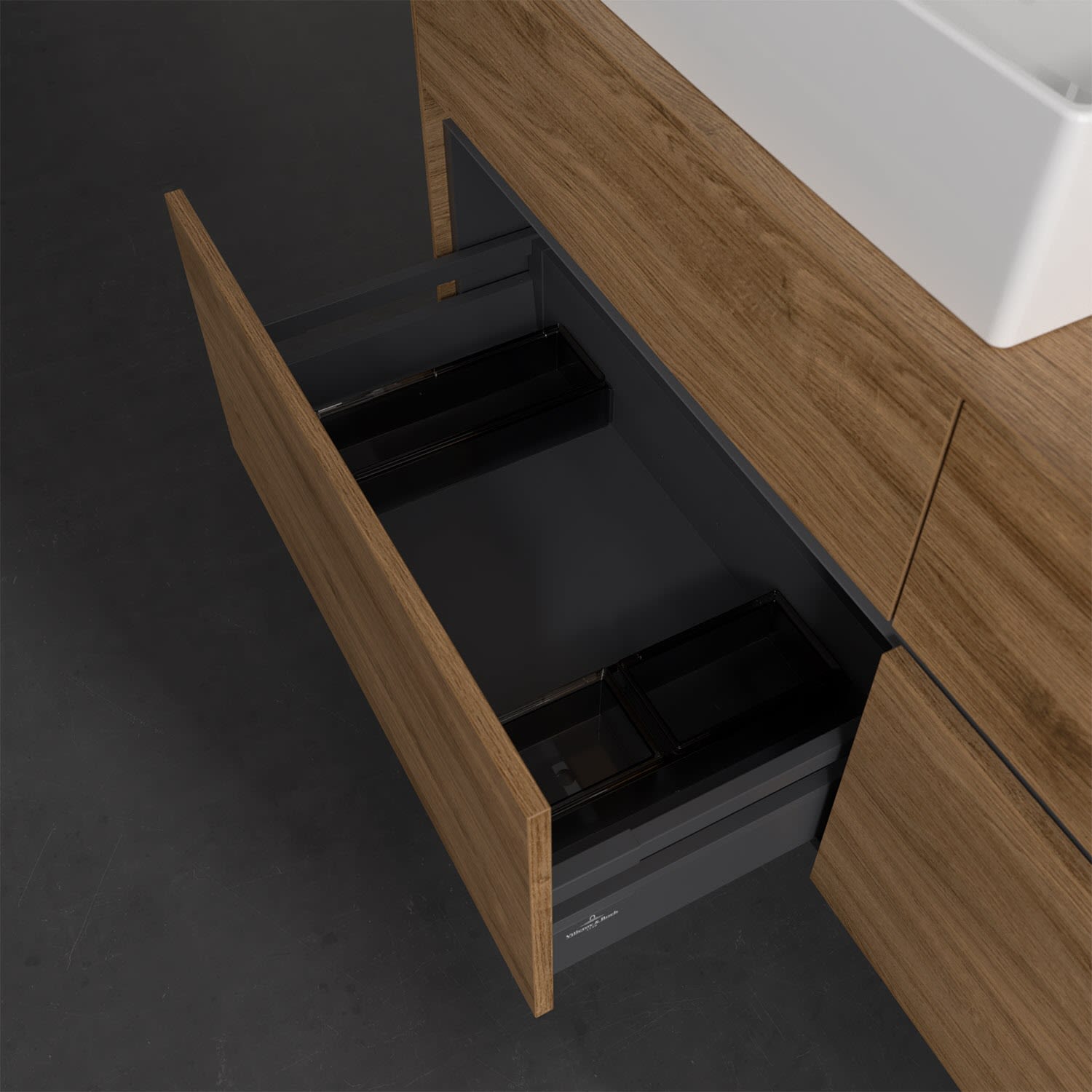 Stauraumwunder im zeitgemäßen Design: Der Villeroy & Boch Waschbeckenunterschrank aus der Collaro Kollektion eignet sich besonders für Familienbäder und bietet genau den Platz, der dort benötigt wird. Eine integrierte Griffleiste sorgt für eine schlichte, moderne Front. Im Inneren bietet das Möbelstück mit vier Auszügen erstaunlich viel Komfort – ermöglicht durch großzügiges Platzangebot und den integrierten Antirutschboden. Variabel setzbare Glasabtrennungen und mitgelieferte Accessory Boxen sorgen für den nötigen Überblick. Dank SoftClosing und Selbsteinzug lassen sich die Auszüge nach der Nutzung lautlos schließen. Für eine besonders leichte Reinigung sorgt die pflegeleichte Direktbeschichtung.
