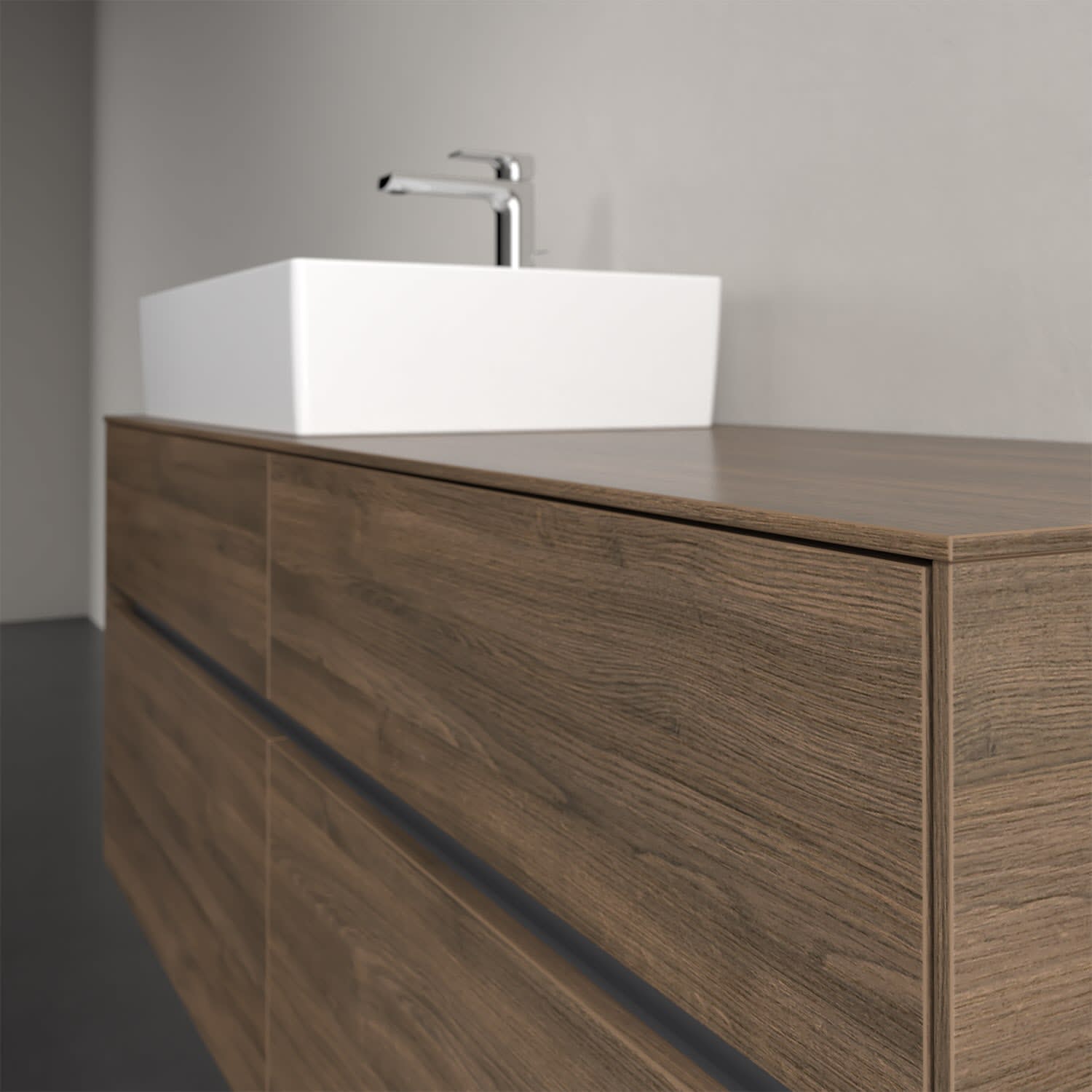 Stauraumwunder im zeitgemäßen Design: Der Villeroy & Boch Waschbeckenunterschrank aus der Collaro Kollektion eignet sich besonders für Familienbäder und bietet genau den Platz, der dort benötigt wird. Eine integrierte Griffleiste sorgt für eine schlichte, moderne Front. Im Inneren bietet das Möbelstück mit vier Auszügen erstaunlich viel Komfort – ermöglicht durch großzügiges Platzangebot und den integrierten Antirutschboden. Variabel setzbare Glasabtrennungen und mitgelieferte Accessory Boxen sorgen für den nötigen Überblick. Dank SoftClosing und Selbsteinzug lassen sich die Auszüge nach der Nutzung lautlos schließen. Für eine besonders leichte Reinigung sorgt die pflegeleichte Direktbeschichtung.