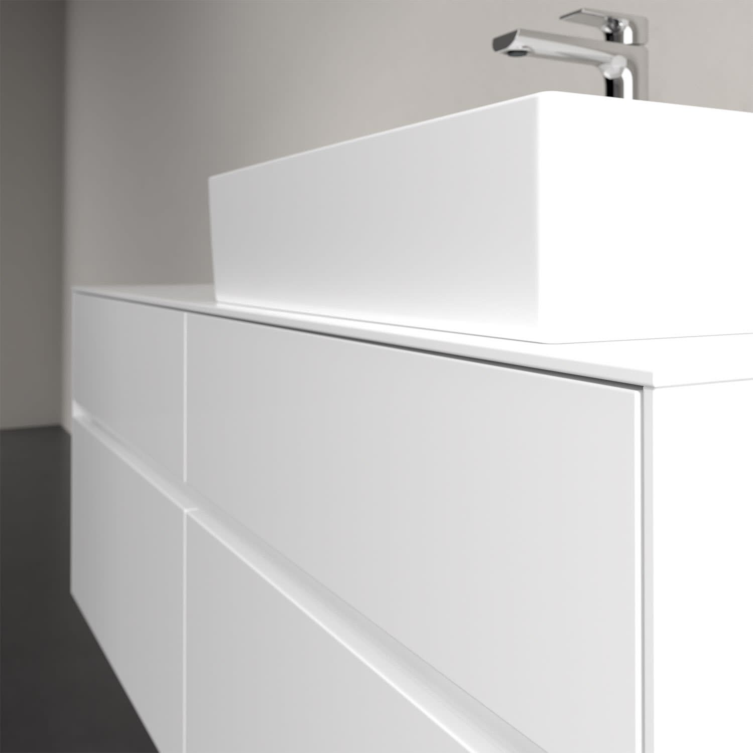 Stauraumwunder im zeitgemäßen Design: Der Villeroy & Boch Waschbeckenunterschrank aus der Collaro Kollektion eignet sich besonders für Familienbäder und bietet genau den Platz, der dort benötigt wird. Eine integrierte Griffleiste sorgt für eine schlichte, moderne Front. Im Inneren bietet das Möbelstück mit vier Auszügen erstaunlich viel Komfort – ermöglicht durch großzügiges Platzangebot und den integrierten Antirutschboden. Variabel setzbare Glasabtrennungen und mitgelieferte Accessory Boxen sorgen für den nötigen Überblick. Dank SoftClosing und Selbsteinzug lassen sich die Auszüge nach der Nutzung lautlos schließen. Für eine besonders leichte Pflege sorgt die widerstandsfähige Acryloberfläche.