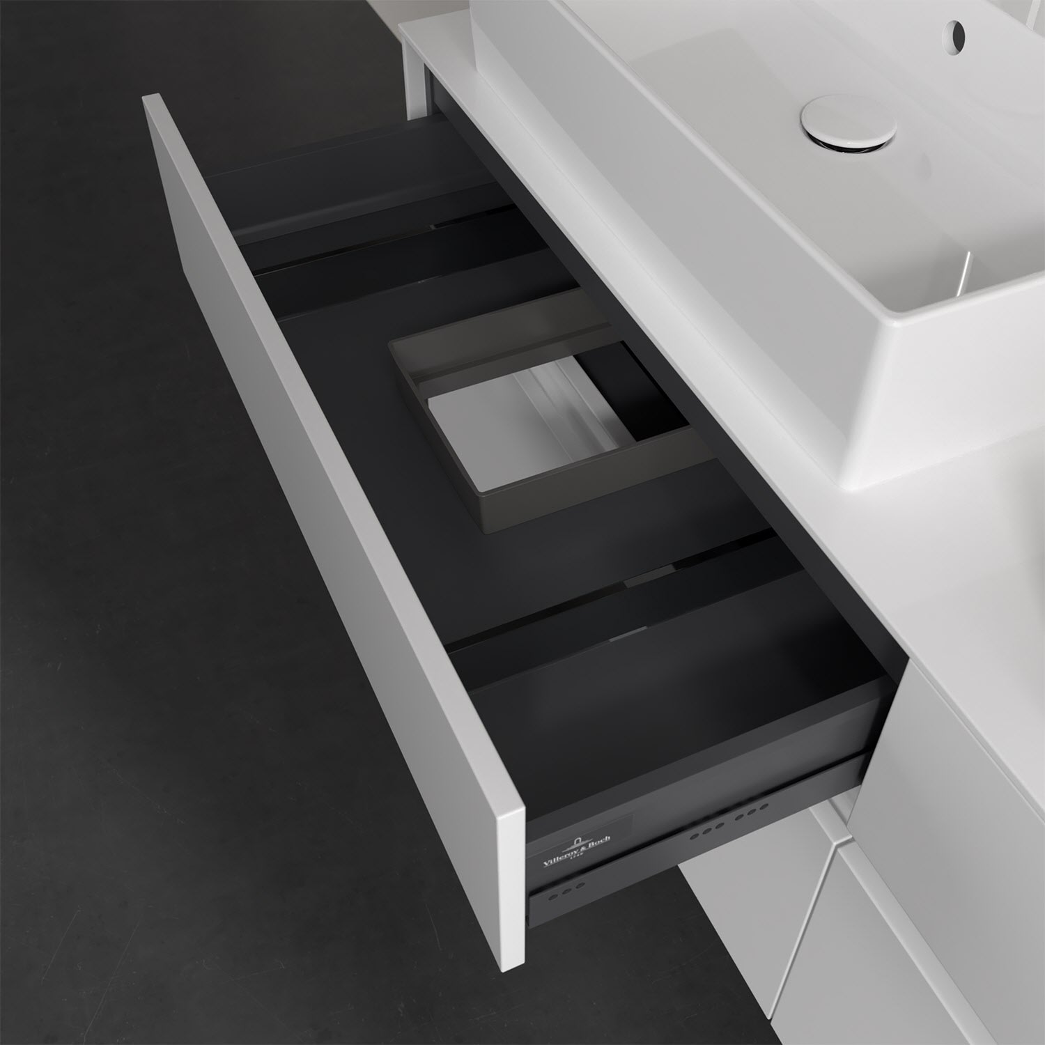 Stauraumwunder im zeitgemäßen Design: Der Villeroy & Boch Waschbeckenunterschrank aus der Collaro Kollektion eignet sich besonders für Familienbäder und bietet genau den Platz, der dort benötigt wird. Eine integrierte Griffleiste sorgt für eine schlichte, moderne Front. Steuern lässt sich das Licht über einen Touch-Sensor seitlich am Unterschrank. Im Inneren bietet das Möbelstück mit vier Auszügen erstaunlich viel Komfort – ermöglicht durch großzügiges Platzangebot und den integrierten Antirutschboden. Variabel setzbare Glasabtrennungen und mitgelieferte Accessory Boxen sorgen für den nötigen Überblick. Dank SoftClosing und Selbsteinzug lassen sich die Auszüge nach der Nutzung lautlos schließen. Für eine besonders leichte Pflege sorgt die widerstandsfähige Acryloberfläche.