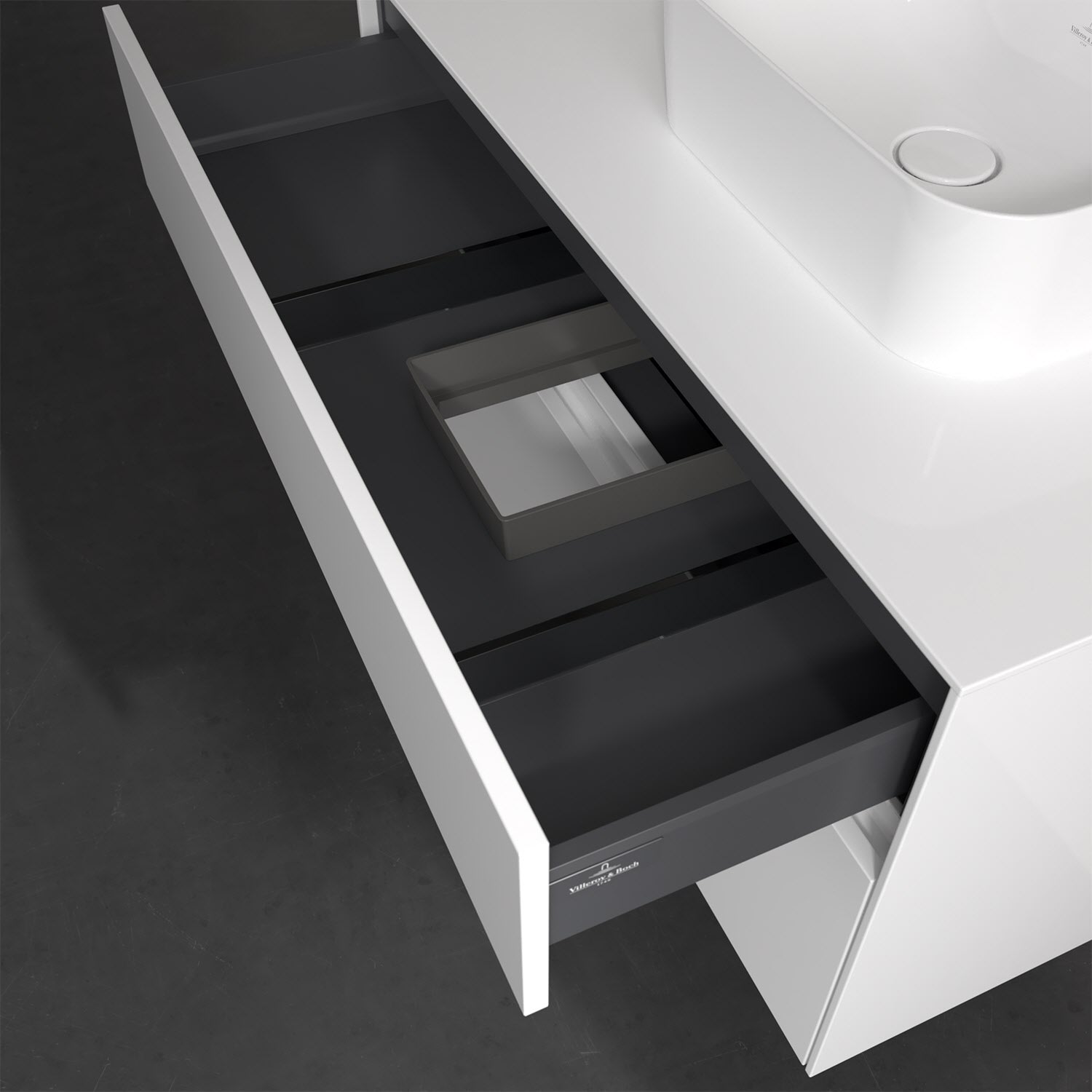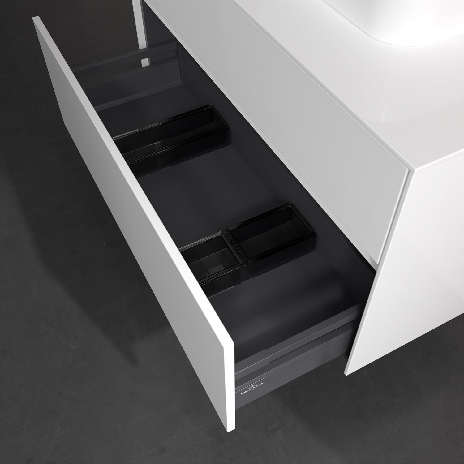 Zeitgemäßes Design und feine Linien: Der Villeroy & Boch Waschbeckenunterschrank aus der Collaro Kollektion mit zwei Auszügen glänzt mit vielen Vorzügen. Eine integrierte Griffleiste sorgt für eine schlichte, moderne Front. Im Inneren bietet das Möbelstück erstaunlich viel Komfort – ermöglicht durch großzügigen Stauraum und den integrierten Antirutschboden. Die variabel setzbaren Glasabtrennungen und die mitgelieferte Accessory Box bieten Badutensilien ausreichend Platz und sorgen für den nötigen Überblick. Dank SoftClosing und Selbsteinzug lassen sich die Auszüge nach der Nutzung lautlos schließen. Für eine besonders leichte Pflege sorgt die widerstandsfähige Acryloberfläche.