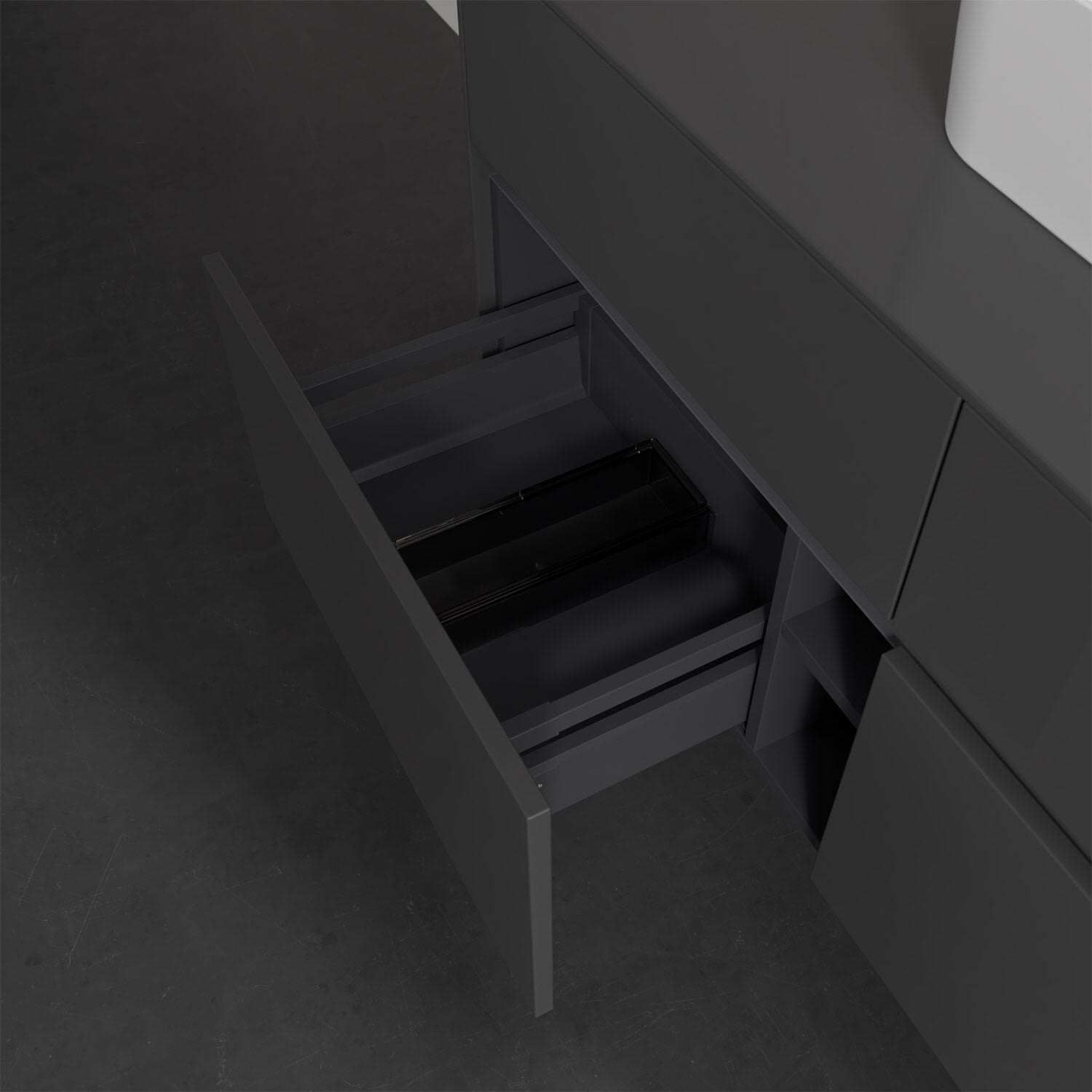Stauraumwunder im zeitgemäßen Design: Der Villeroy & Boch Waschbeckenunterschrank aus der Collaro Kollektion eignet sich besonders für Familienbäder und bietet genau den Platz, der dort benötigt wird. Eine integrierte Griffleiste sorgt für eine schlichte, moderne Front. Im Inneren bietet das Möbelstück mit vier Auszügen erstaunlich viel Komfort – ermöglicht durch großzügiges Platzangebot und den integrierten Antirutschboden. Variabel setzbare Glasabtrennungen und mitgelieferte Accessory Boxen sorgen für den nötigen Überblick. Dank SoftClosing und Selbsteinzug lassen sich die Auszüge nach der Nutzung lautlos schließen. Für eine besonders leichte Pflege sorgt die widerstandsfähige Acryloberfläche.