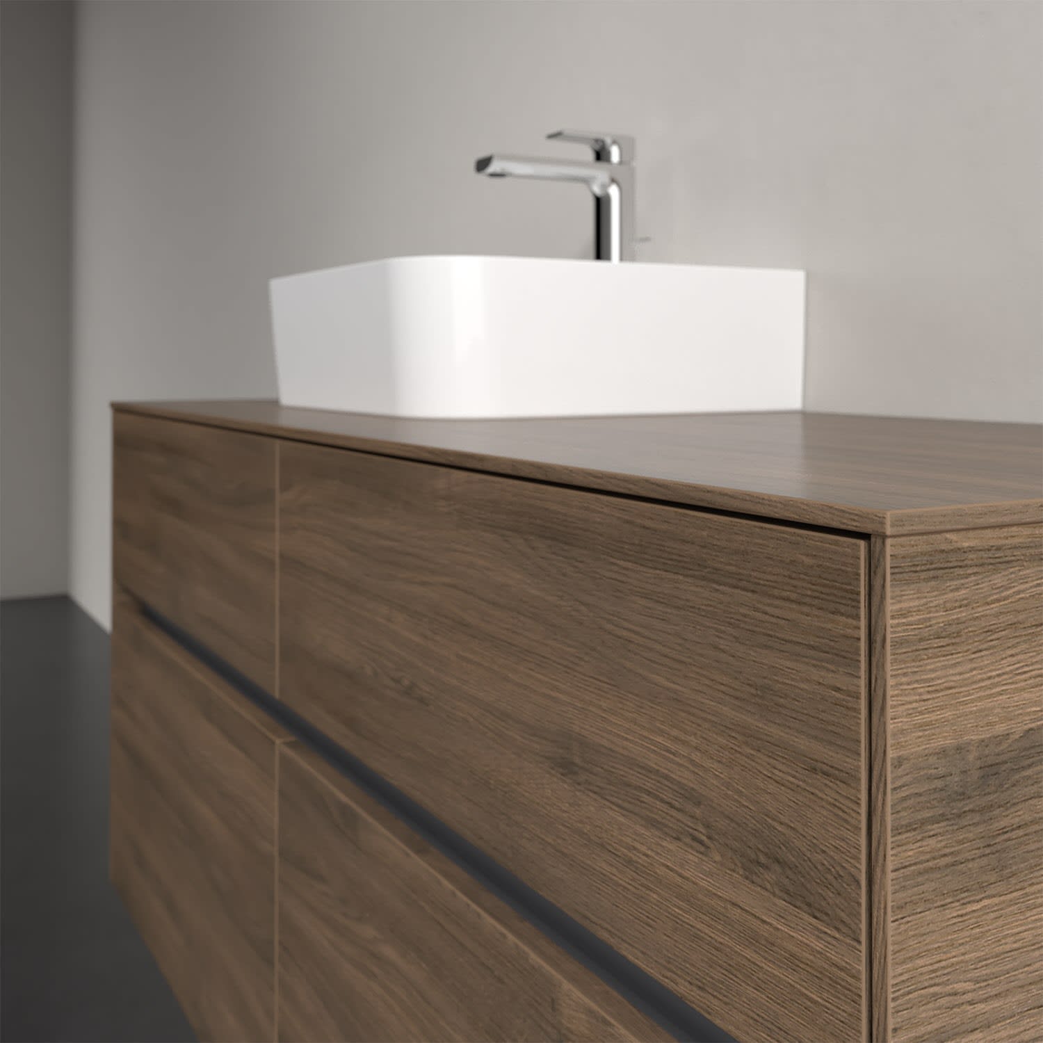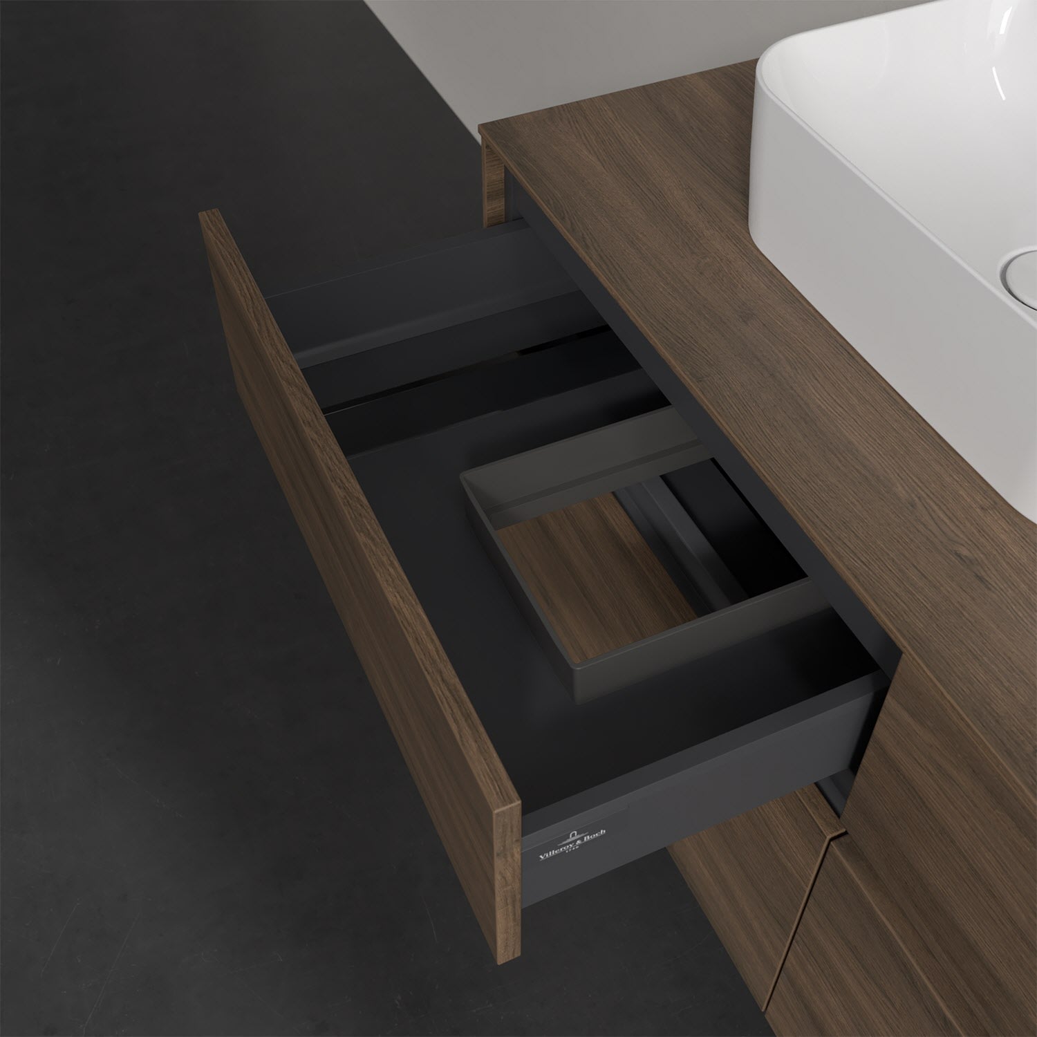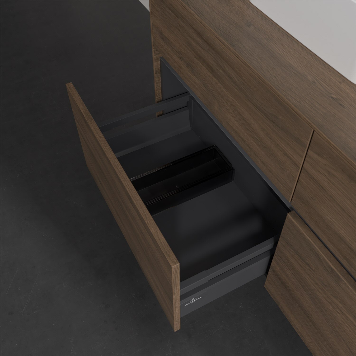 Stauraumwunder im zeitgemäßen Design: Der Villeroy & Boch Waschbeckenunterschrank aus der Collaro Kollektion eignet sich besonders für Familienbäder und bietet genau den Platz, der dort benötigt wird. Eine integrierte Griffleiste sorgt für eine schlichte, moderne Front. Im Inneren bietet das Möbelstück mit vier Auszügen erstaunlich viel Komfort – ermöglicht durch großzügiges Platzangebot und den integrierten Antirutschboden. Variabel setzbare Glasabtrennungen und mitgelieferte Accessory Boxen sorgen für den nötigen Überblick. Dank SoftClosing und Selbsteinzug lassen sich die Auszüge nach der Nutzung lautlos schließen. Für eine besonders leichte Pflege sorgt die pflegeleichte Direktbeschichtung.