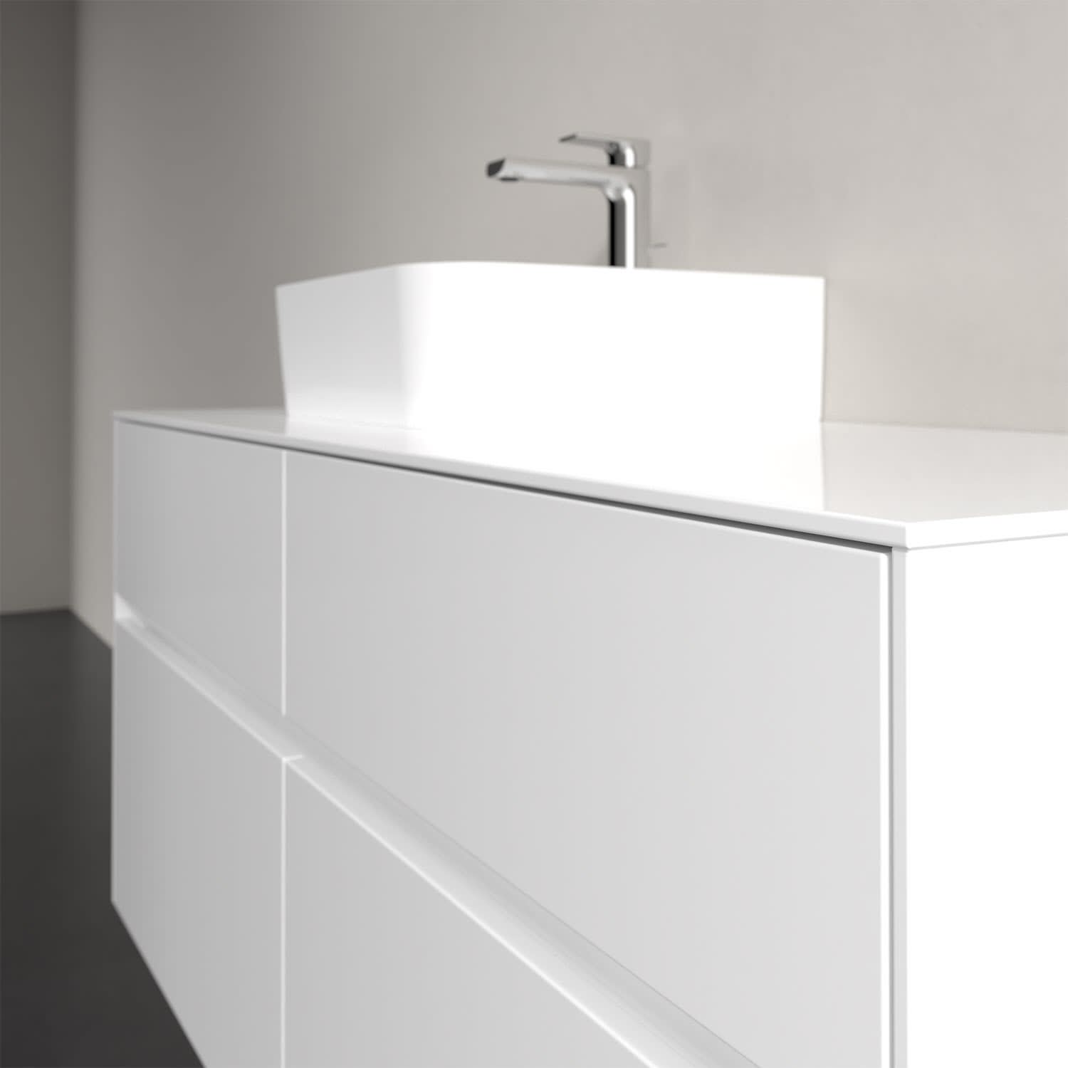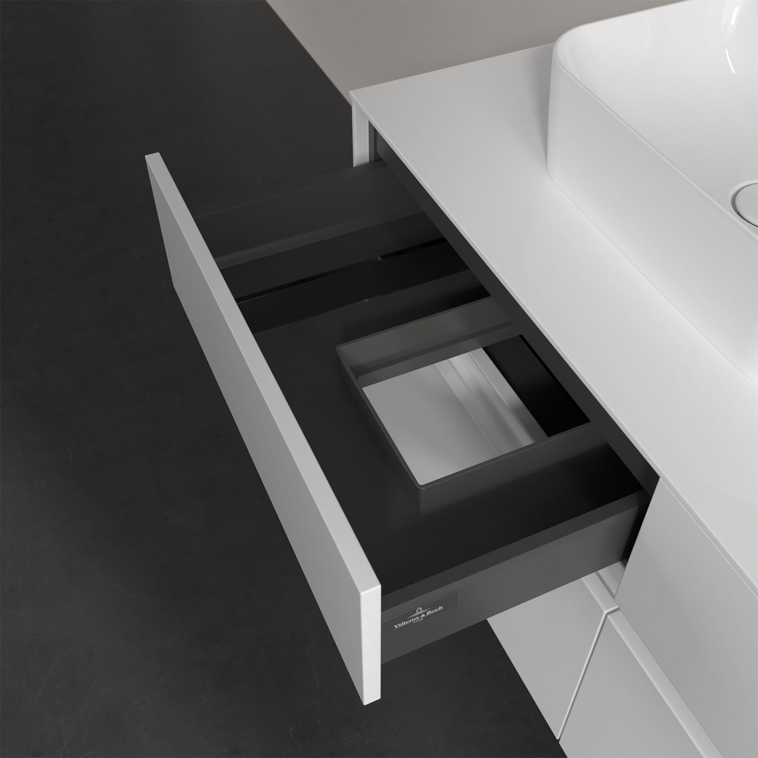 Stauraumwunder im zeitgemäßen Design: Der Villeroy & Boch Waschbeckenunterschrank aus der Collaro Kollektion eignet sich besonders für Familienbäder und bietet genau den Platz, der dort benötigt wird. Eine integrierte Griffleiste sorgt für eine schlichte, moderne Front. Im Inneren bietet das Möbelstück mit vier Auszügen erstaunlich viel Komfort – ermöglicht durch großzügiges Platzangebot und den integrierten Antirutschboden. Variabel setzbare Glasabtrennungen und mitgelieferte Accessory Boxen sorgen für den nötigen Überblick. Dank SoftClosing und Selbsteinzug lassen sich die Auszüge nach der Nutzung lautlos schließen. Für eine besonders leichte Pflege sorgt die widerstandsfähige Acryloberfläche.