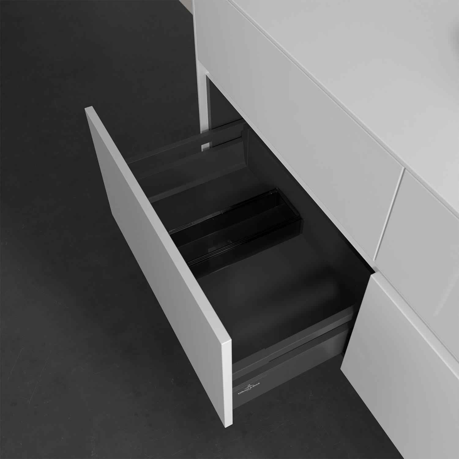 Stauraumwunder im zeitgemäßen Design: Der Villeroy & Boch Waschbeckenunterschrank aus der Collaro Kollektion eignet sich besonders für Familienbäder und bietet genau den Platz, der dort benötigt wird. Eine integrierte Griffleiste sorgt für eine schlichte, moderne Front. Im Inneren bietet das Möbelstück mit vier Auszügen erstaunlich viel Komfort – ermöglicht durch großzügiges Platzangebot und den integrierten Antirutschboden. Variabel setzbare Glasabtrennungen und mitgelieferte Accessory Boxen sorgen für den nötigen Überblick. Dank SoftClosing und Selbsteinzug lassen sich die Auszüge nach der Nutzung lautlos schließen. Für eine besonders leichte Pflege sorgt die widerstandsfähige Acryloberfläche.