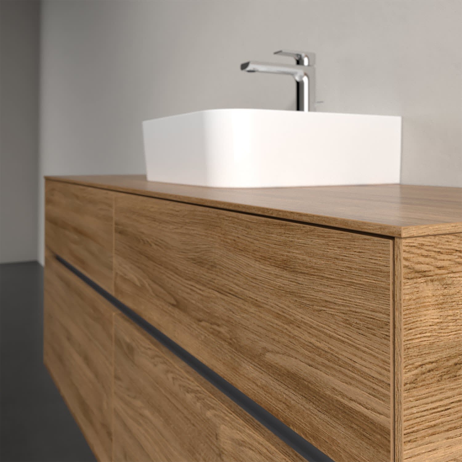 Stauraumwunder im zeitgemäßen Design: Der Villeroy & Boch Waschbeckenunterschrank aus der Collaro Kollektion eignet sich besonders für Familienbäder und bietet genau den Platz, der dort benötigt wird. Eine integrierte Griffleiste sorgt für eine schlichte, moderne Front. Steuern lässt sich das Licht über einen Touch-Sensor seitlich am Unterschrank. Im Inneren bietet das Möbelstück mit vier Auszügen erstaunlich viel Komfort – ermöglicht durch großzügiges Platzangebot und den integrierten Antirutschboden. Variabel setzbare Glasabtrennungen und mitgelieferte Accessory Boxen sorgen für den nötigen Überblick. Dank SoftClosing und Selbsteinzug lassen sich die Auszüge nach der Nutzung lautlos schließen. Für eine besonders leichte Pflege sorgt die pflegeleichte Direktbeschichtung.