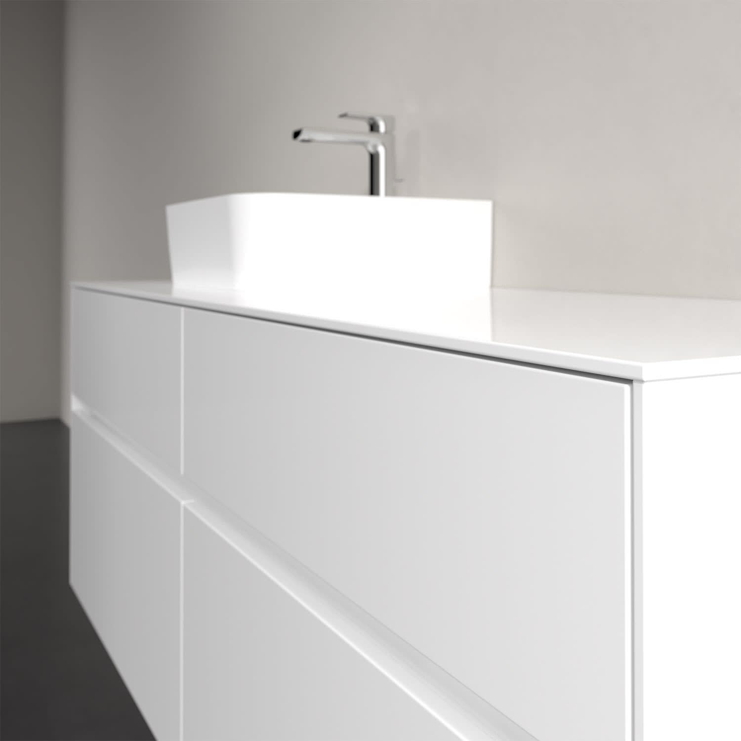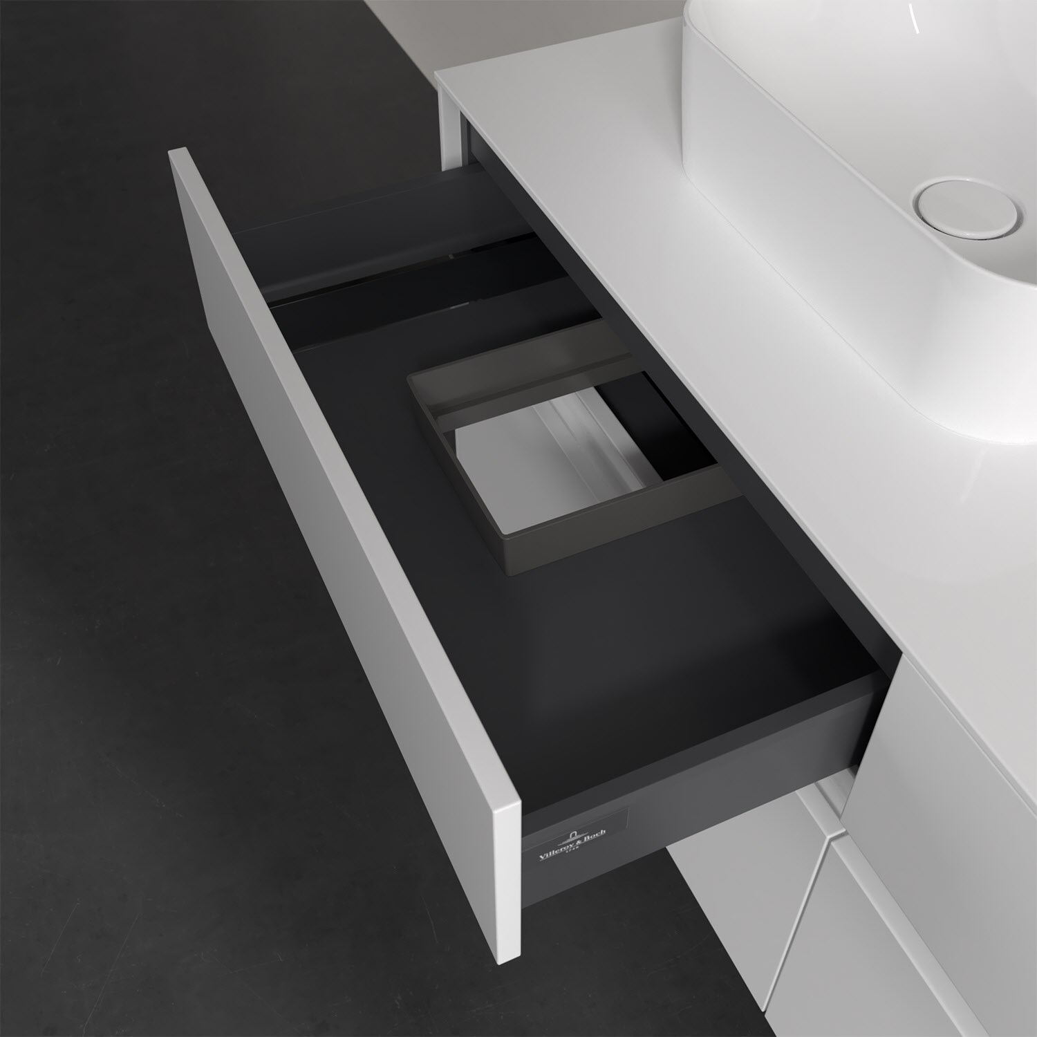 Stauraumwunder im zeitgemäßen Design: Der Villeroy & Boch Waschbeckenunterschrank aus der Collaro Kollektion eignet sich besonders für Familienbäder und bietet genau den Platz, der dort benötigt wird. Eine integrierte Griffleiste sorgt für eine schlichte, moderne Front. Im Inneren bietet das Möbelstück mit vier Auszügen erstaunlich viel Komfort – ermöglicht durch großzügiges Platzangebot und den integrierten Antirutschboden. Variabel setzbare Glasabtrennungen und mitgelieferte Accessory Boxen sorgen für den nötigen Überblick. Dank SoftClosing und Selbsteinzug lassen sich die Auszüge nach der Nutzung lautlos schließen. Für eine besonders leichte Pflege sorgt die widerstandsfähige Acryloberfläche.