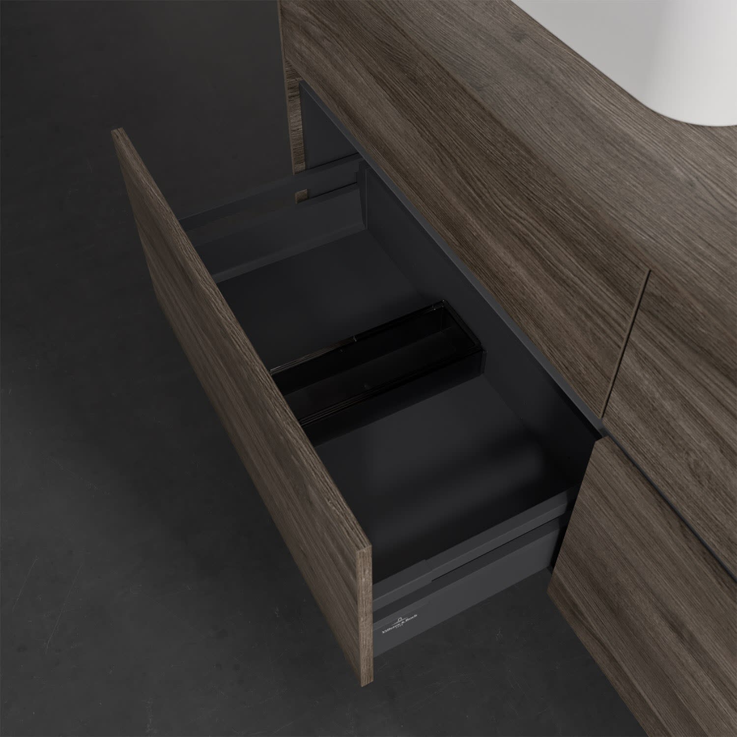 Stauraumwunder im zeitgemäßen Design: Der Villeroy & Boch Waschbeckenunterschrank aus der Collaro Kollektion eignet sich besonders für Familienbäder und bietet genau den Platz, der dort benötigt wird. Eine integrierte Griffleiste sorgt für eine schlichte, moderne Front. Im Inneren bietet das Möbelstück mit vier Auszügen erstaunlich viel Komfort – ermöglicht durch großzügiges Platzangebot und den integrierten Antirutschboden. Variabel setzbare Glasabtrennungen und mitgelieferte Accessory Boxen sorgen für den nötigen Überblick. Dank SoftClosing und Selbsteinzug lassen sich die Auszüge nach der Nutzung lautlos schließen. Für eine besonders leichte Pflege sorgt die pflegeleichte Direktbeschichtung.