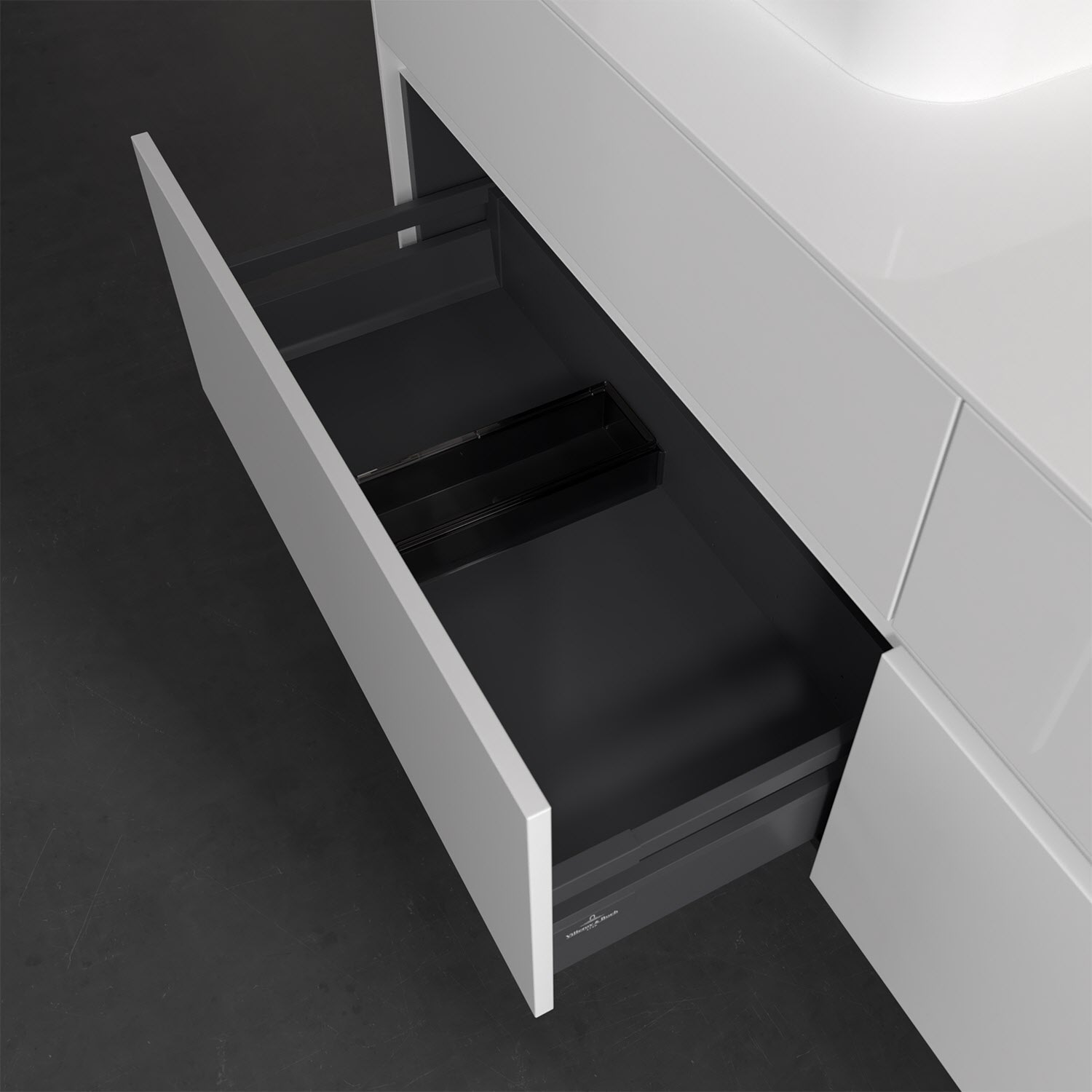 Stauraumwunder im zeitgemäßen Design: Der Villeroy & Boch Waschbeckenunterschrank aus der Collaro Kollektion eignet sich besonders für Familienbäder und bietet genau den Platz, der dort benötigt wird. Eine integrierte Griffleiste sorgt für eine schlichte, moderne Front. Steuern lässt sich das Licht über einen Touch-Sensor seitlich am Unterschrank. Im Inneren bietet das Möbelstück mit vier Auszügen erstaunlich viel Komfort – ermöglicht durch großzügiges Platzangebot und den integrierten Antirutschboden. Variabel setzbare Glasabtrennungen und mitgelieferte Accessory Boxen sorgen für den nötigen Überblick. Dank SoftClosing und Selbsteinzug lassen sich die Auszüge nach der Nutzung lautlos schließen. Für eine besonders leichte Pflege sorgt die widerstandsfähige Acryloberfläche.