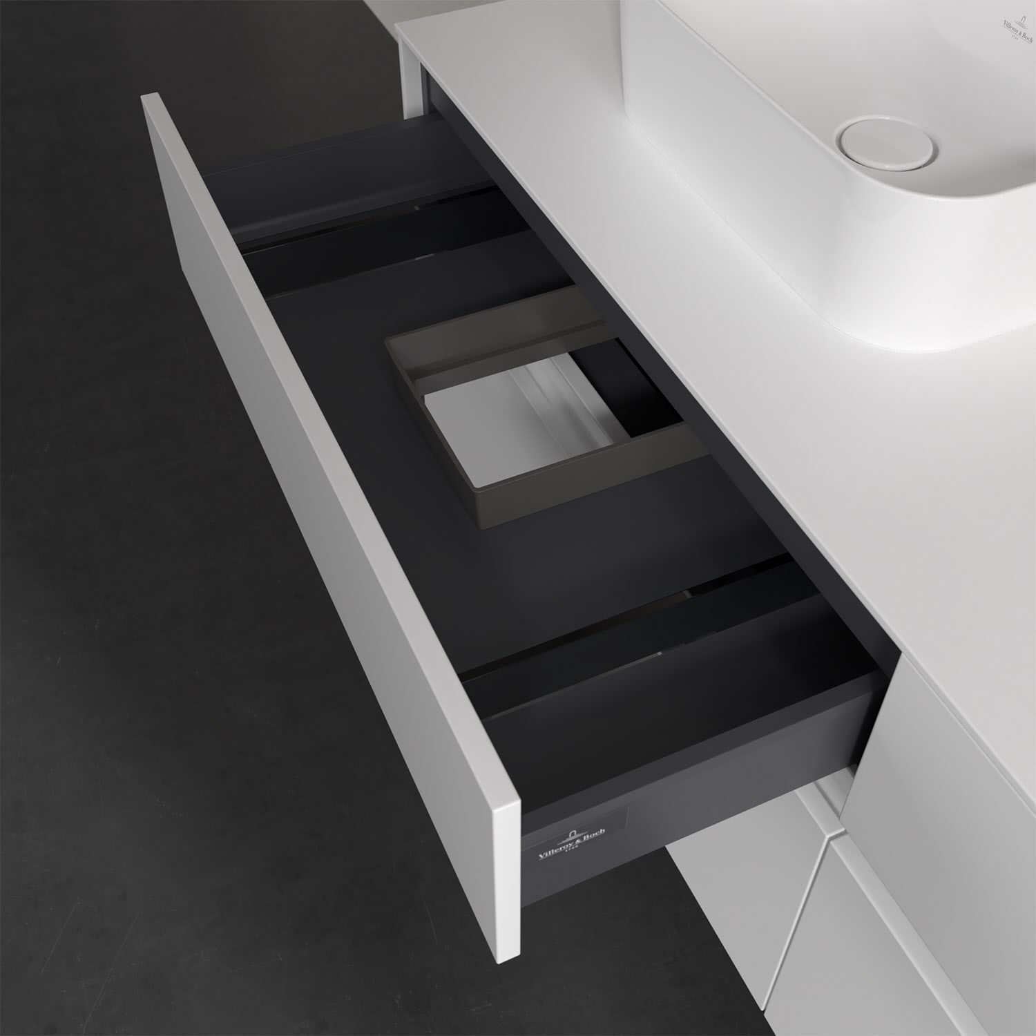 Stauraumwunder im zeitgemäßen Design: Der Villeroy & Boch Waschbeckenunterschrank aus der Collaro Kollektion eignet sich besonders für Familienbäder und bietet genau den Platz, der dort benötigt wird. Eine integrierte Griffleiste sorgt für eine schlichte, moderne Front. Steuern lässt sich das Licht über einen Touch-Sensor seitlich am Unterschrank. Im Inneren bietet das Möbelstück mit vier Auszügen erstaunlich viel Komfort – ermöglicht durch großzügiges Platzangebot und den integrierten Antirutschboden. Variabel setzbare Glasabtrennungen und mitgelieferte Accessory Boxen sorgen für den nötigen Überblick. Dank SoftClosing und Selbsteinzug lassen sich die Auszüge nach der Nutzung lautlos schließen. Für eine besonders leichte Pflege sorgt die pflegeleichte Direktbeschichtung.