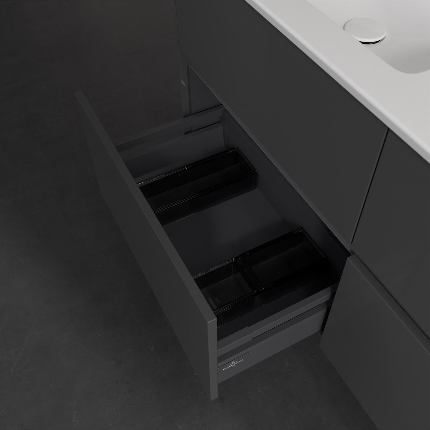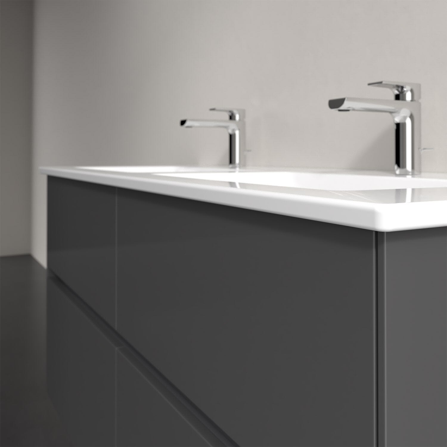 Stauraumwunder im zeitgemäßen Design: Der Villeroy & Boch Waschbeckenunterschrank aus der Collaro Kollektion eignet sich besonders für Familienbäder und bietet genau den Platz, der dort benötigt wird. Eine integrierte Griffleiste sorgt für eine schlichte, moderne Front. Steuern lässt sich das Licht über einen Touch-Sensor seitlich am Unterschrank. Im Inneren bietet das Möbelstück mit vier Auszügen erstaunlich viel Komfort – ermöglicht durch großzügiges Platzangebot und den integrierten Antirutschboden. Variabel setzbare Glasabtrennungen und mitgelieferte Accessory Boxen sorgen für den nötigen Überblick. Dank SoftClosing und Selbsteinzug lassen sich die Auszüge nach der Nutzung lautlos schließen. Für eine besonders leichte Pflege sorgt die widerstandsfähige Acryloberfläche.