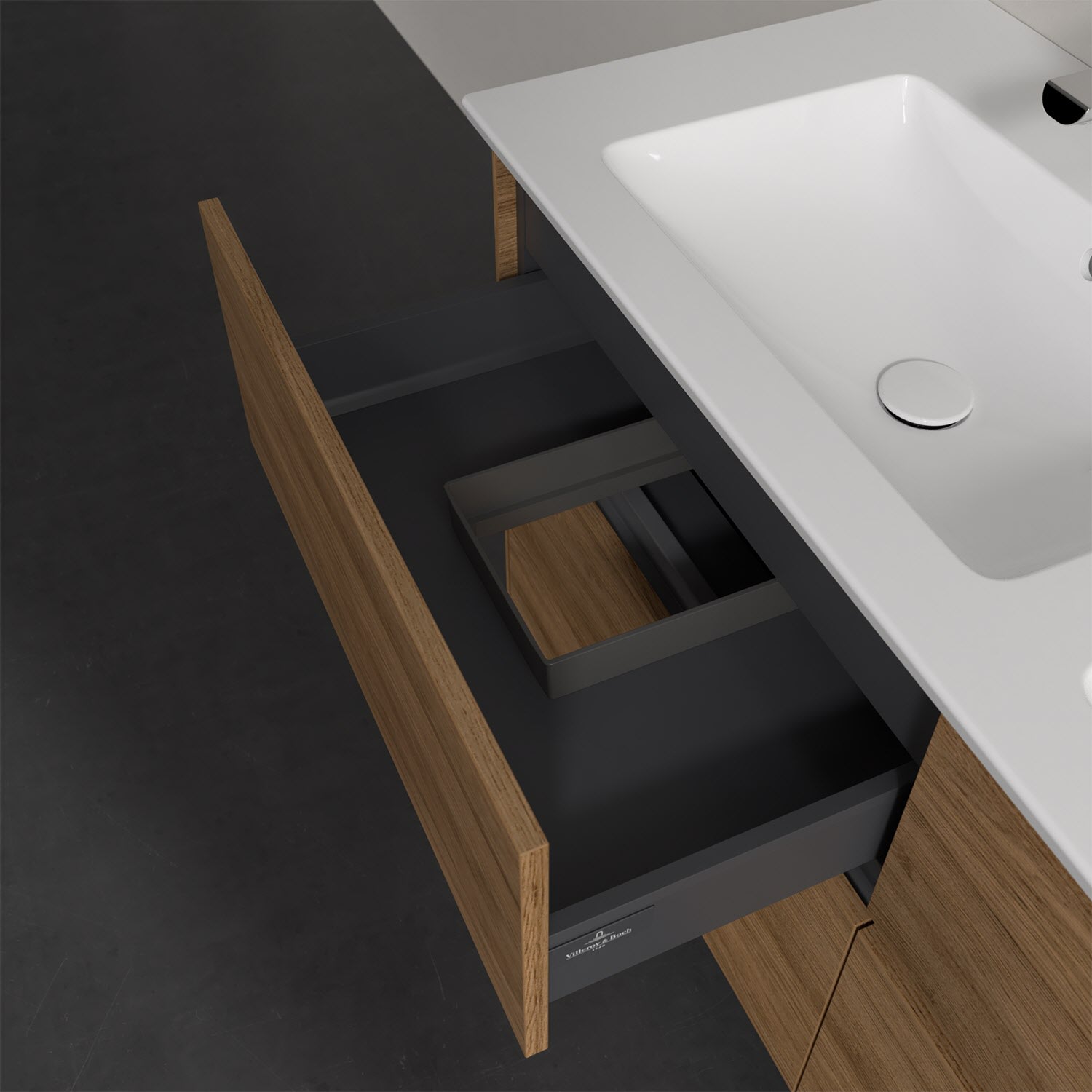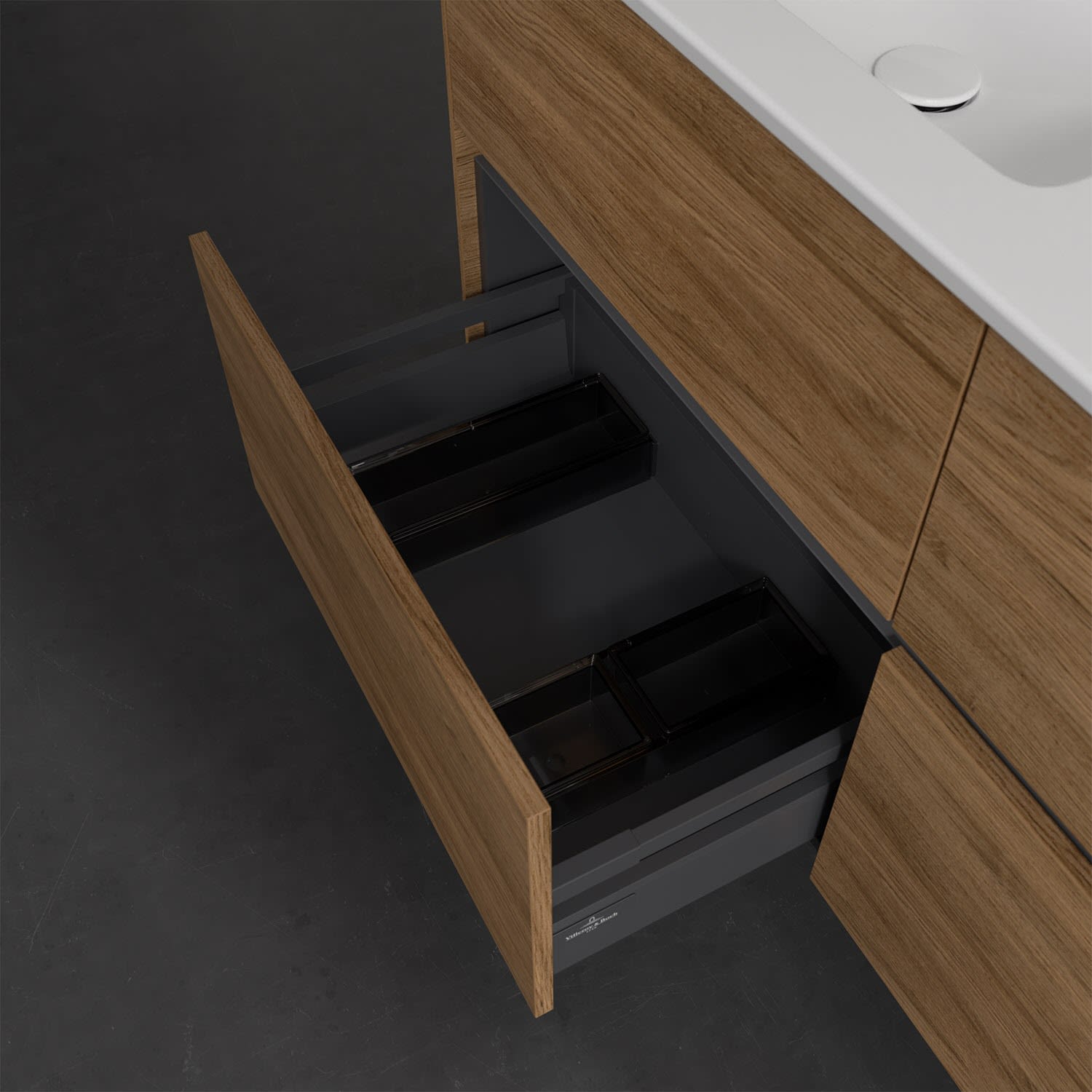 Stauraumwunder im zeitgemäßen Design: Der Villeroy & Boch Waschbeckenunterschrank aus der Collaro Kollektion eignet sich besonders für Familienbäder und bietet genau den Platz, der dort benötigt wird. Eine integrierte Griffleiste sorgt für eine schlichte, moderne Front. Steuern lässt sich das Licht über einen Touch-Sensor seitlich am Unterschrank. Im Inneren bietet das Möbelstück mit vier Auszügen erstaunlich viel Komfort – ermöglicht durch großzügiges Platzangebot und den integrierten Antirutschboden. Variabel setzbare Glasabtrennungen und mitgelieferte Accessory Boxen sorgen für den nötigen Überblick. Dank SoftClosing und Selbsteinzug lassen sich die Auszüge nach der Nutzung lautlos schließen. Für eine besonders leichte Pflege sorgt die pflegeleichte Direktbeschichtung.