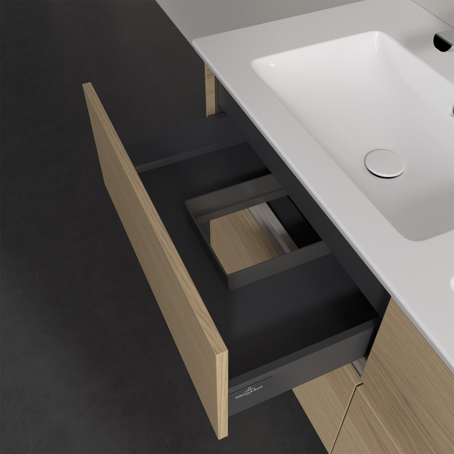 Stauraumwunder im zeitgemäßen Design: Der Villeroy & Boch Waschbeckenunterschrank aus der Collaro Kollektion eignet sich besonders für Familienbäder und bietet genau den Platz, der dort benötigt wird. Eine integrierte Griffleiste sorgt für eine schlichte, moderne Front. Steuern lässt sich das Licht über einen Touch-Sensor seitlich am Unterschrank. Im Inneren bietet das Möbelstück mit vier Auszügen erstaunlich viel Komfort – ermöglicht durch großzügiges Platzangebot und den integrierten Antirutschboden. Variabel setzbare Glasabtrennungen und mitgelieferte Accessory Boxen sorgen für den nötigen Überblick. Dank SoftClosing und Selbsteinzug lassen sich die Auszüge nach der Nutzung lautlos schließen. Für eine besonders leichte Pflege sorgt die pflegeleichte Direktbeschichtung.