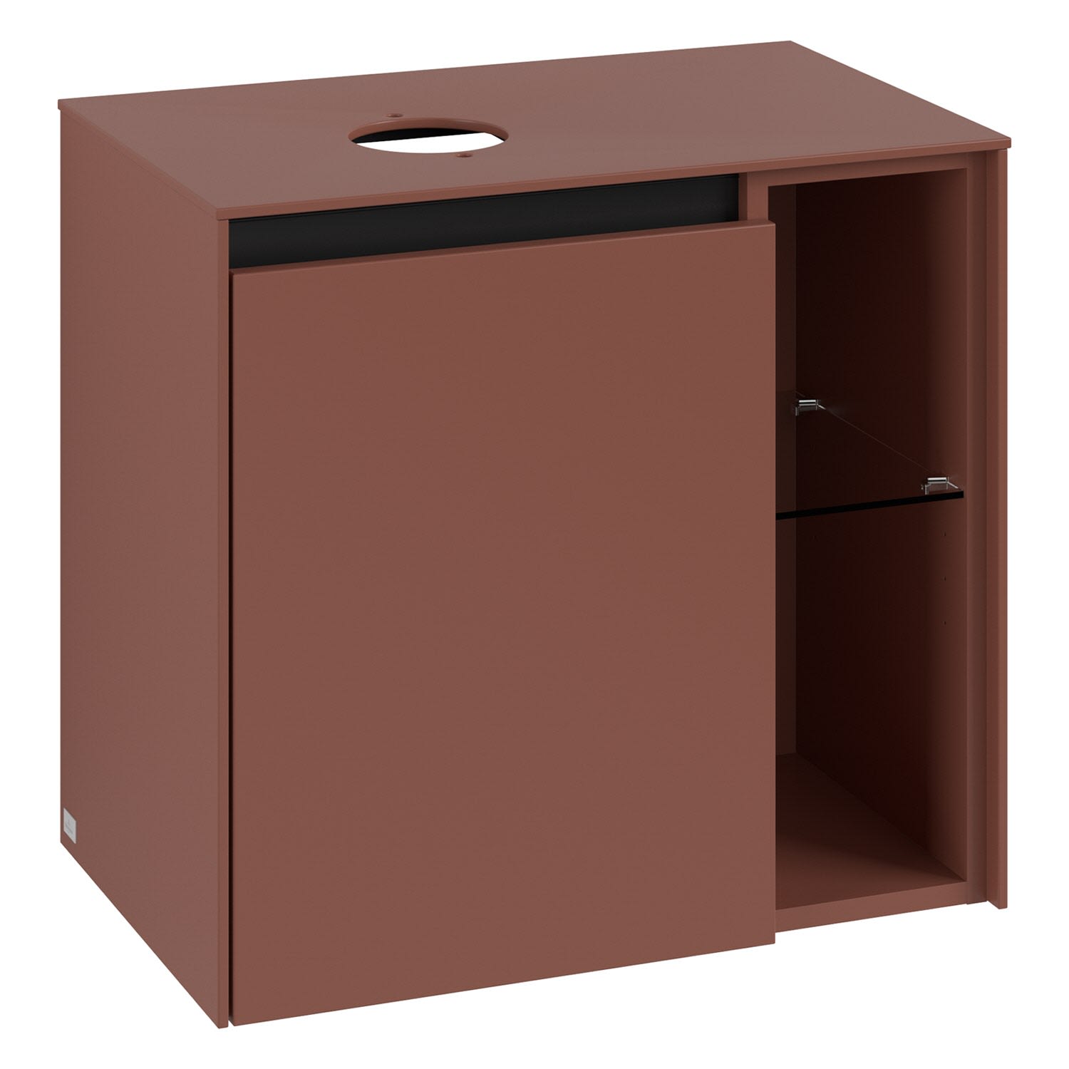 Kompaktes Design und feine Linien: Der Villeroy & Boch Waschbeckenunterschrank aus der Collaro Kollektion passt perfekt in kleine Bäder oder Gästebäder. Die dezente, grifflose Tür lässt sich dank der waagerechten Griffmulde bequem öffnen und gleitet dank SoftClosing-Technik selbst bei schwungvollem Schließen lautlos wieder zu. Im Inneren gibt es praktische Ablageflächen, die durch einen Fachboden getrennt werden – ideal für das ordentliche Verstauen von Toilettenpapier, Reinigungsmittel und mehr. Rechterhand befindet sich ein schickes Regalelement mit Glasfachboden. Es eignet sich zum dekorativen Verstauen von Handtüchern oder Pflegeprodukten, die stets griffbereit sein sollen.