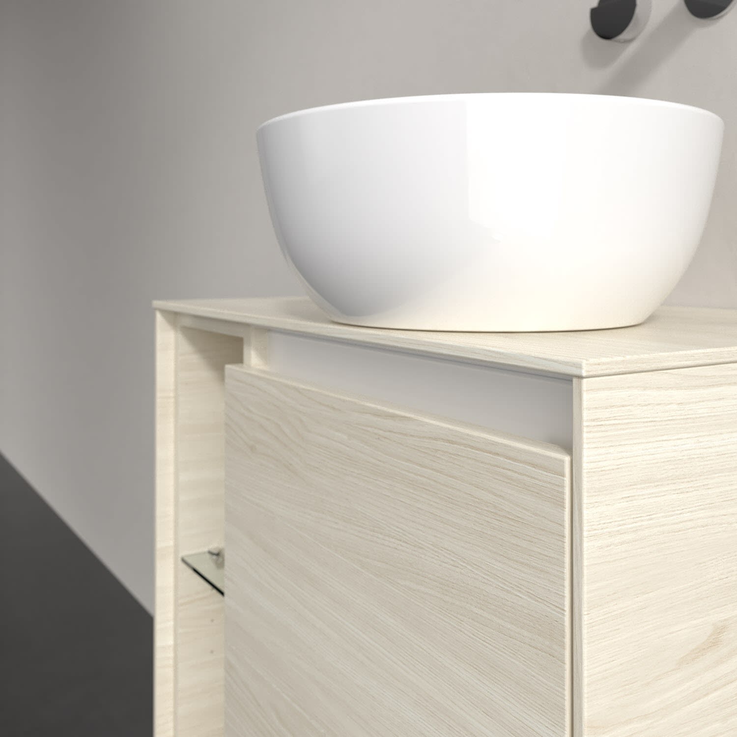 Kompaktes Design und feine Linien: Der Villeroy & Boch Waschbeckenunterschrank aus der Collaro Kollektion passt perfekt in kleine Bäder oder Gästebäder. Eine Griffmulde mit integrierter, stufenlos einstellbarer LED-Beleuchtung sorgt für eine schlichte, stimmungsvolle Front. Steuern lässt sich das Licht über einen Touch-Sensor seitlich am Unterschrank. Die Tür lässt sich bequem öffnen und gleitet dank SoftClosing-Technik selbst bei schwungvollem Schließen lautlos wieder zu. Im Inneren gibt es praktische Ablageflächen, die durch einen Fachboden getrennt werden – ideal für das ordentliche Verstauen von Toilettenpapier, Reinigungsmittel und mehr. Linkerhand befindet sich ein schickes Regalelement mit Glasfachboden. Es eignet sich zum dekorativen Verstauen von Handtüchern oder Pflegeprodukten, die stets griffbereit sein sollen.