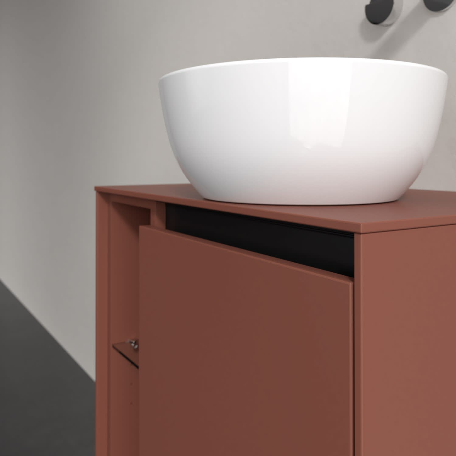 Kompaktes Design und feine Linien: Der Villeroy & Boch Waschbeckenunterschrank aus der Collaro Kollektion passt perfekt in kleine Bäder oder Gästebäder. Eine Griffmulde mit integrierter, stufenlos einstellbarer LED-Beleuchtung sorgt für eine schlichte, stimmungsvolle Front. Steuern lässt sich das Licht über einen Touch-Sensor seitlich am Unterschrank. Die Tür lässt sich bequem öffnen und gleitet dank SoftClosing-Technik selbst bei schwungvollem Schließen lautlos wieder zu. Im Inneren gibt es praktische Ablageflächen, die durch einen Fachboden getrennt werden – ideal für das ordentliche Verstauen von Toilettenpapier, Reinigungsmittel und mehr. Linkerhand befindet sich ein schickes Regalelement mit Glasfachboden. Es eignet sich zum dekorativen Verstauen von Handtüchern oder Pflegeprodukten, die stets griffbereit sein sollen.