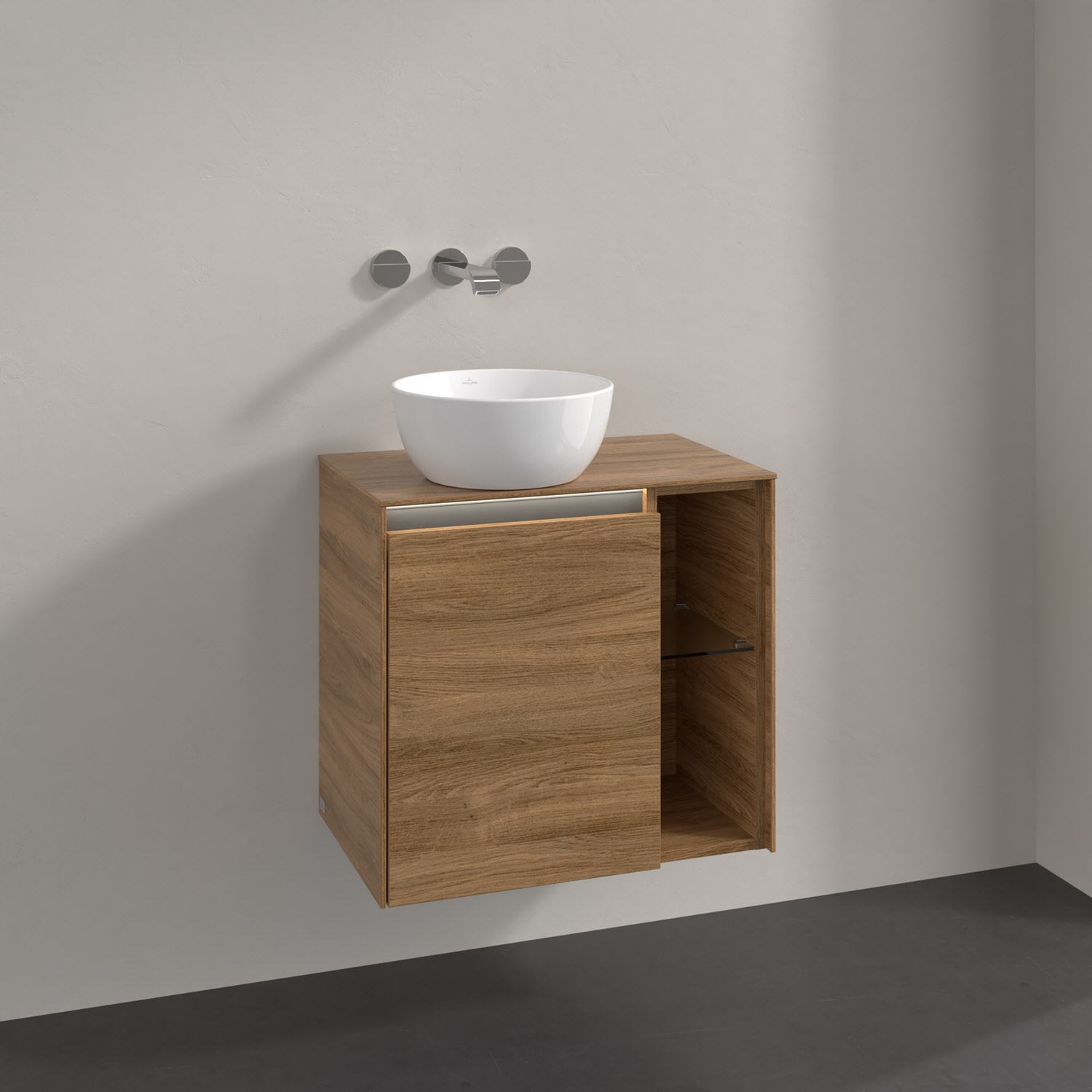 Kompaktes Design und feine Linien: Der Villeroy & Boch Waschbeckenunterschrank aus der Collaro Kollektion passt perfekt in kleine Bäder oder Gästebäder. Eine Griffmulde mit integrierter, stufenlos einstellbarer LED-Beleuchtung sorgt für eine schlichte, stimmungsvolle Front. Steuern lässt sich das Licht über einen Touch-Sensor seitlich am Unterschrank. Die Tür lässt sich bequem öffnen und gleitet dank SoftClosing-Technik selbst bei schwungvollem Schließen lautlos wieder zu. Im Inneren gibt es praktische Ablageflächen, die durch einen Fachboden getrennt werden – ideal für das ordentliche Verstauen von Toilettenpapier, Reinigungsmittel und mehr. Rechterhand befindet sich ein schickes Regalelement mit Glasfachboden. Es eignet sich zum dekorativen Verstauen von Handtüchern oder Pflegeprodukten, die stets griffbereit sein sollen.