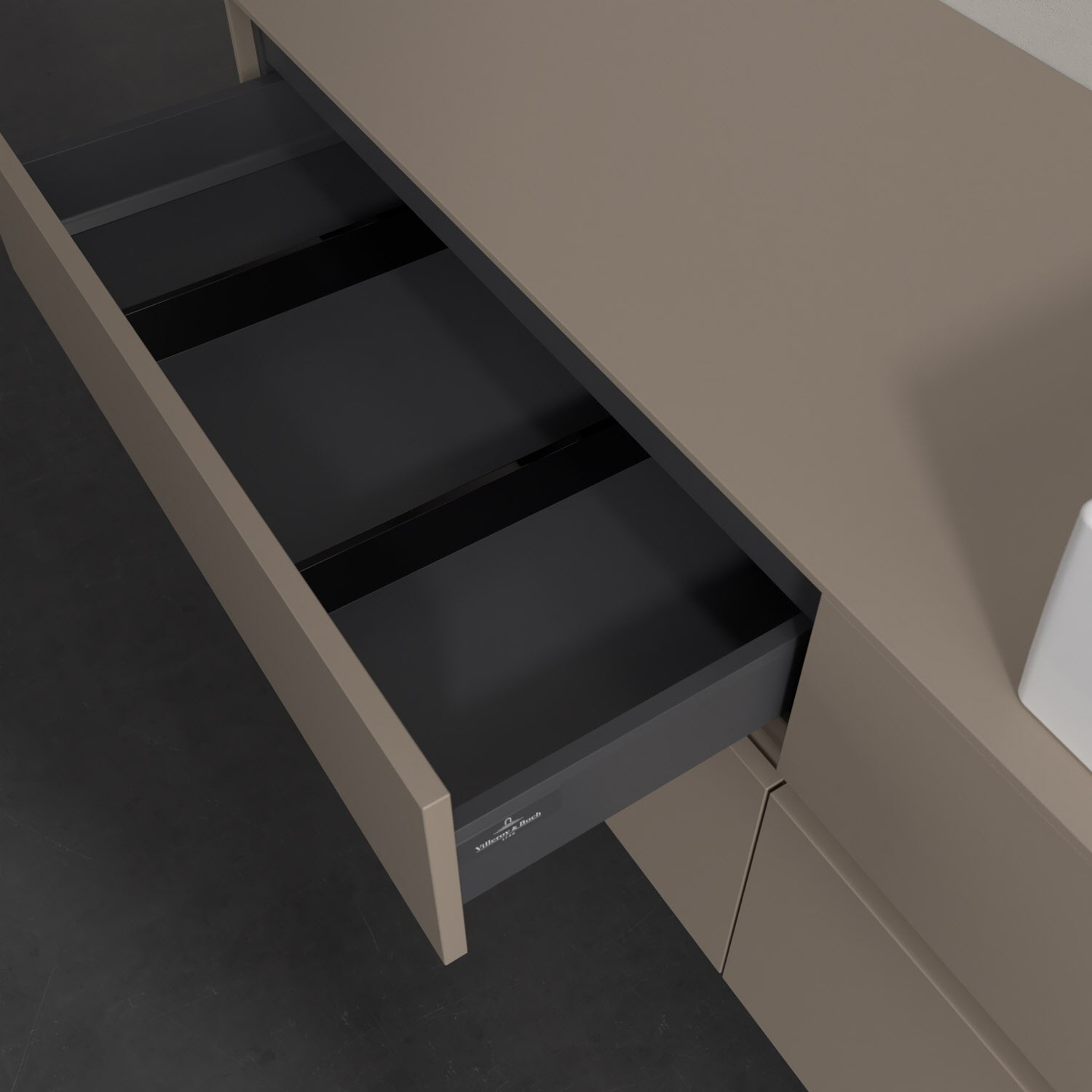 Stauraumwunder im zeitgemäßen Design: Der Villeroy & Boch Waschbeckenunterschrank aus der Collaro Kollektion eignet sich besonders für Familienbäder und bietet genau den Platz, der dort benötigt wird. Stimmungsvolles Highlight der schlichten, modernen Front ist die integrierte Griffmulde mit stufenlos einstellbarer LED-Beleuchtung. Im Inneren bietet das Möbelstück mit vier Auszügen erstaunlich viel Komfort – ermöglicht durch großzügiges Platzangebot und den integrierten Antirutschboden. Variabel setzbare Glasabtrennungen und mitgelieferte Accessory Boxen sorgen für den nötigen Überblick. Dank SoftClosing und Selbsteinzug lassen sich die Auszüge nach der Nutzung lautlos schließen. Die Front ist mit einer hochwertigen Lackierung versehen, deren Anti-Fingerprint-Oberfläche unschönen Fingerabdrücken vorbeugt.
