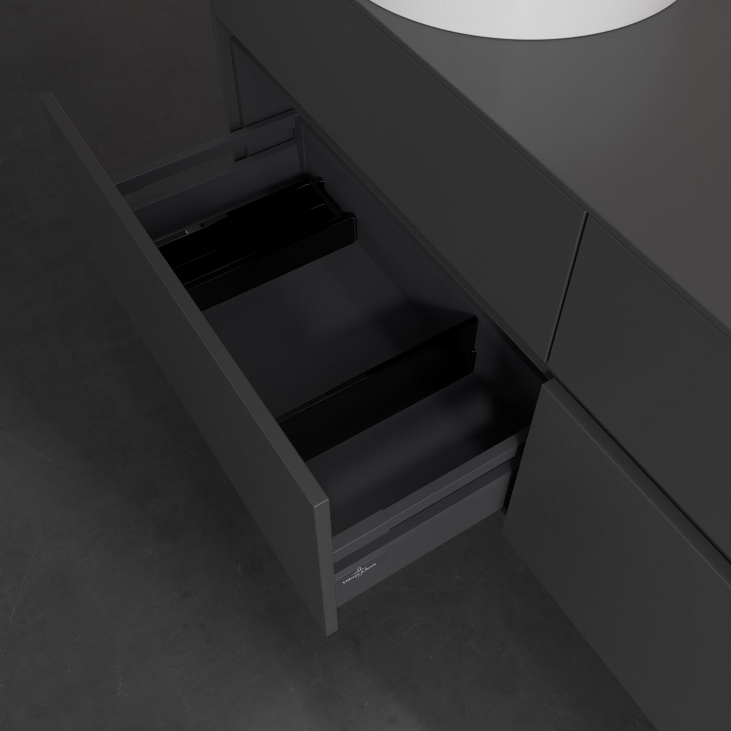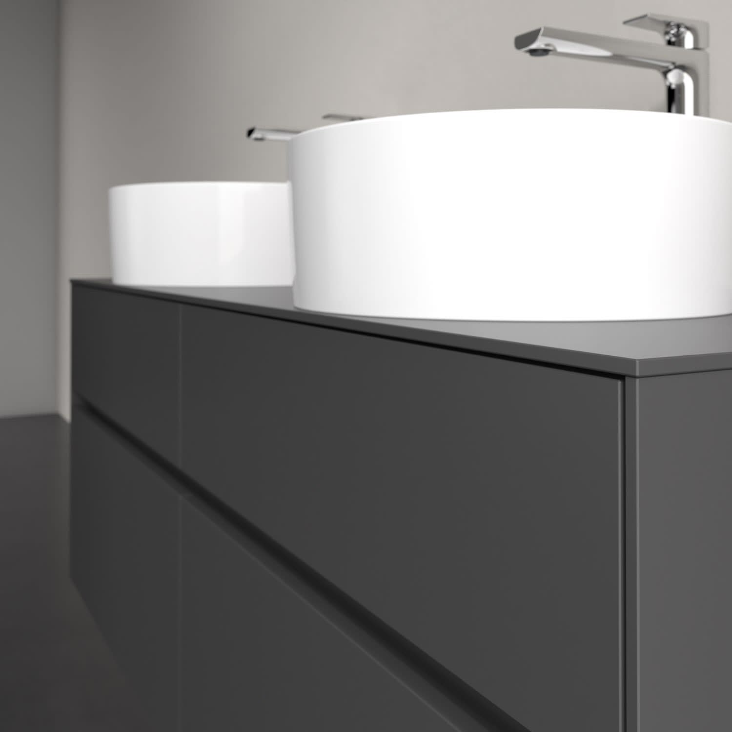 Stauraumwunder im zeitgemäßen Design: Der Villeroy & Boch Waschbeckenunterschrank aus der Collaro Kollektion eignet sich besonders für Familienbäder und bietet genau den Platz, der dort benötigt wird. Stimmungsvolles Highlight der schlichten, modernen Front ist die integrierte Griffmulde mit stufenlos einstellbarer LED-Beleuchtung. Steuern lässt sie sich über einen Touch-Sensor seitlich am Unterschrank. Im Inneren bietet das Möbelstück mit vier Auszügen erstaunlich viel Komfort – ermöglicht durch großzügiges Platzangebot und den integrierten Antirutschboden. Variabel setzbare Glasabtrennungen und mitgelieferte Accessory Boxen sorgen für den nötigen Überblick. Dank SoftClosing und Selbsteinzug lassen sich die Auszüge nach der Nutzung lautlos schließen. Die Front ist mit einer hochwertigen Lackierung versehen, deren Anti-Fingerprint-Oberfläche unschönen Fingerabdrücken vorbeugt.